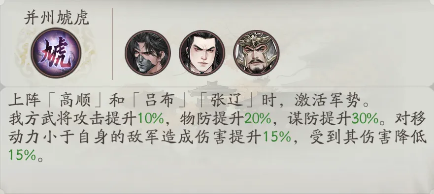 高顺自身具备并州虓[xiāo]虎军势,该军势搭配吕布、张辽时激活,吕布、张辽是目前非常优质的超角色,这三人吕布是一个大C,高顺和张辽有输出能力也有辅吕布的能力。该军势特效对移动力小于自身敌军有增减伤,对部分骑兵不太好吃到,对其余兵种时基本算是常驻效果了。