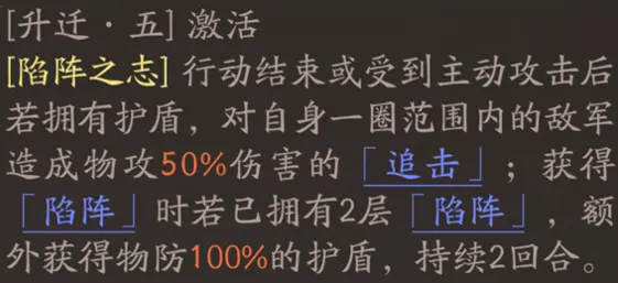 升阶方面,5阶主要提升高顺的追伤能力、额外获得护盾的能力。5阶各个效果,搭配部分技能,能够让高顺更好的获取+保持陷阵状态,同时依靠更易获得的护盾提升自身的肉度。