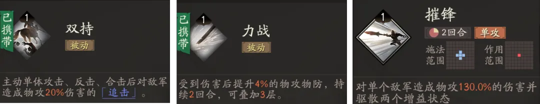 高顺还具备双持、力战两个被动技能以及一个单体技能摧锋。