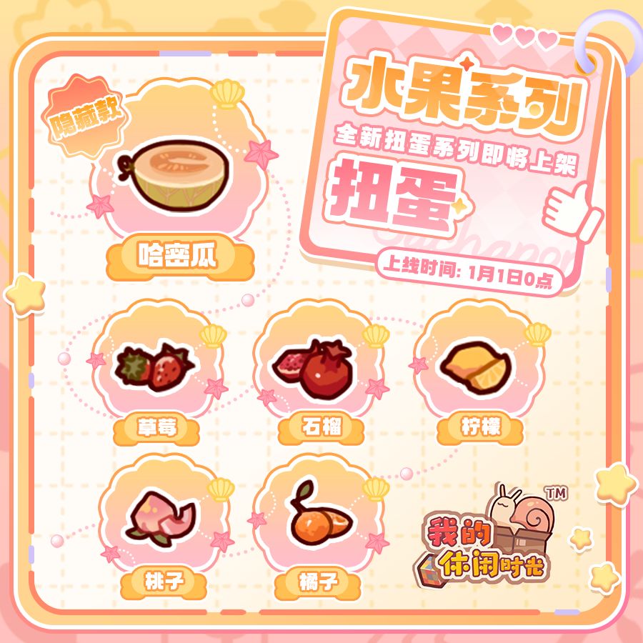 🍓全新扭蛋系列「水果」即将上架!1月1日0:00-1月31日23:59期间,在「手机」-「日历」-「扭蛋」中使用扭蛋券进行抽取即有机会获得「水果」系列扭蛋摆件喔!
