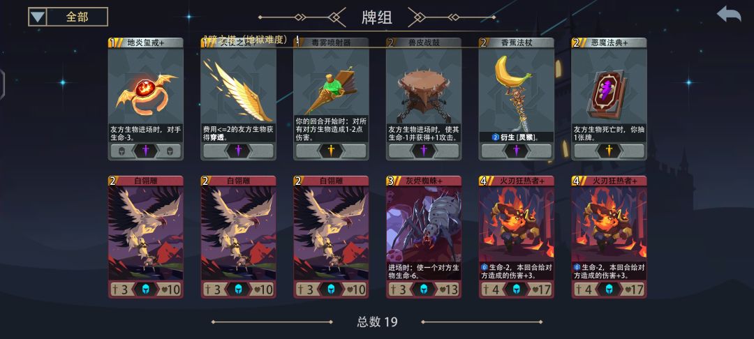 理想卡组:过牌(2~3张)清场卡(1~2张)直伤卡(2张)生物装备(1~2张)英雄装备(4~5张)卡组厚度(19~21张)