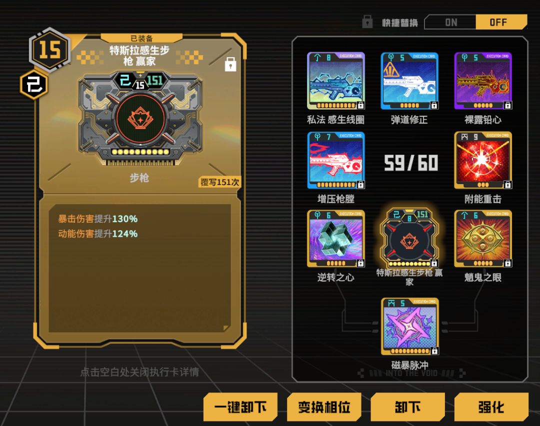 最小攻速为4,但是暴击率、暴击伤害和触发几率取决于武器,这个改动让上个版本的触发流强度直跌谷底,所以在稍后的配卡推荐中只推荐特斯拉感生步枪(电狙)被动鬼卡流派