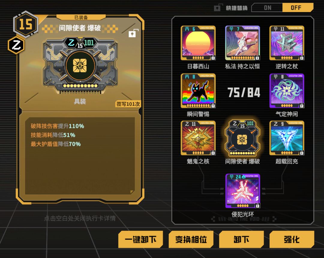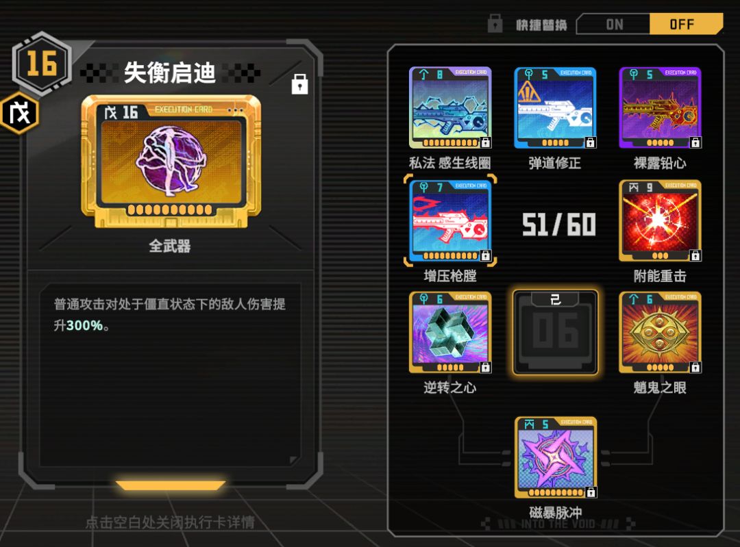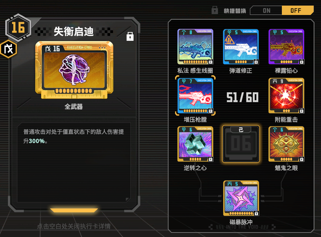 私法 感生电圈搭配魈鬼之眼转化动能伤害,考虑到卡位比较紧张只带上数值最高的元素卡(没有私法版可以用任意普通版元素替代),带上增压枪膛增加武器伤害,其他卡位堆双爆,带上失衡启迪来对失衡的敌人造成更高的伤害(赋能重击目前在贸易中心中的价格较高,暂时没有的玩家可以用元素卡替代)