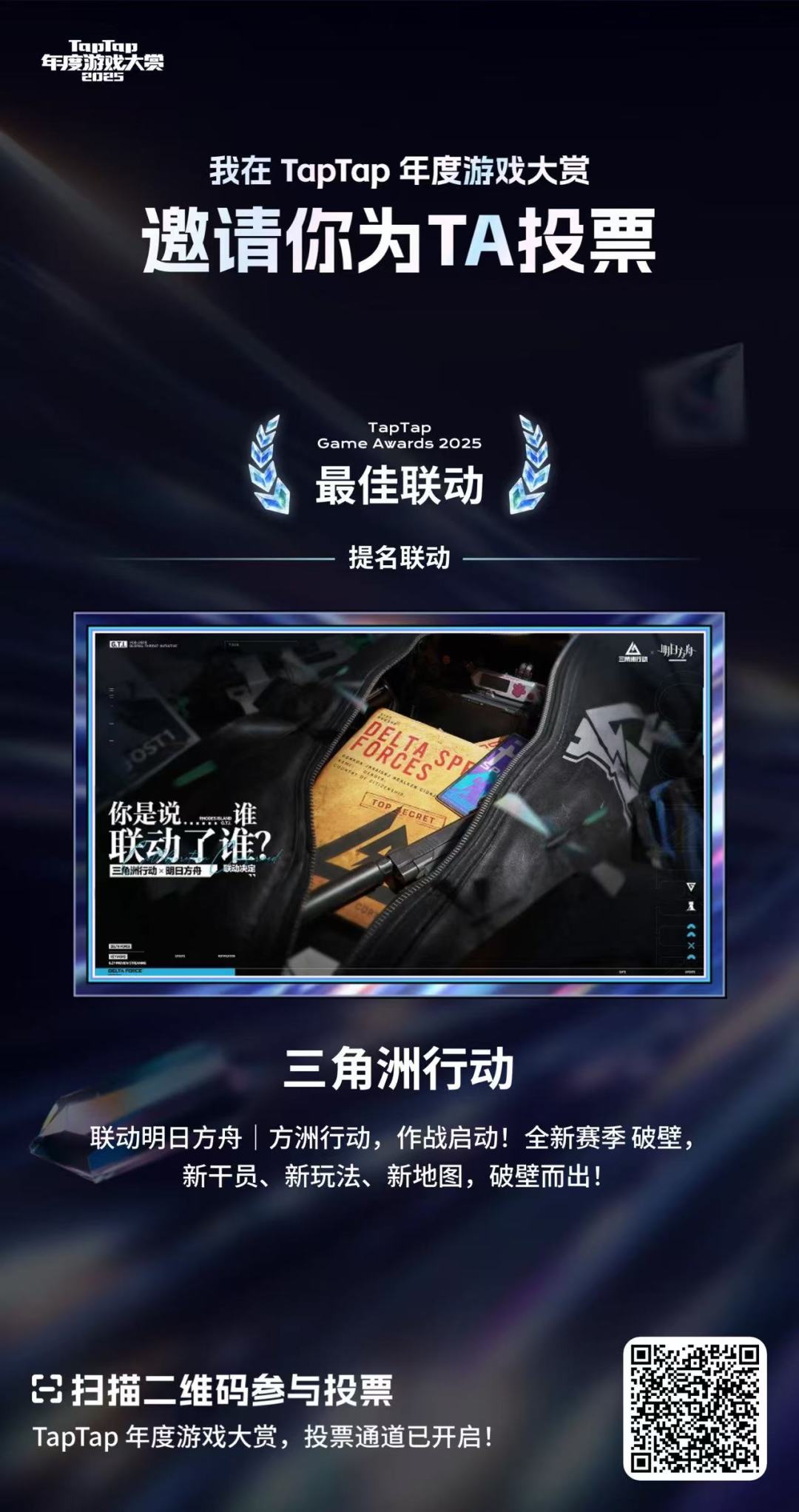 恭喜《三角洲行动》入选「2025 TapTap 年度游戏大赏」玩家奖项!暖冬平安,感谢各位干员的大力支持,快来给洲投上一票吧,点击下方链接: