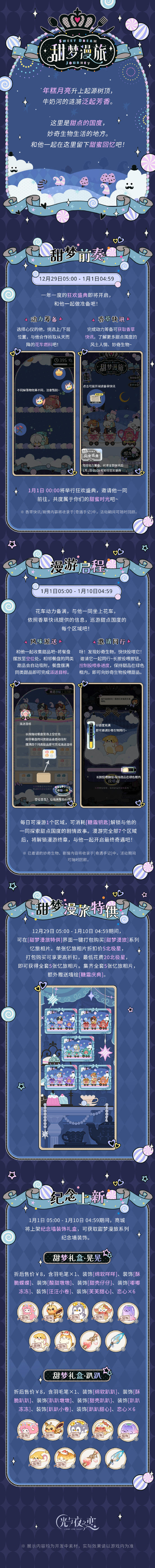 1月1日 05:00 - 1月10日 04:59期间,商城将上架纪念墙装饰礼盒,可获取甜梦漫旅系列纪念墙装饰。
