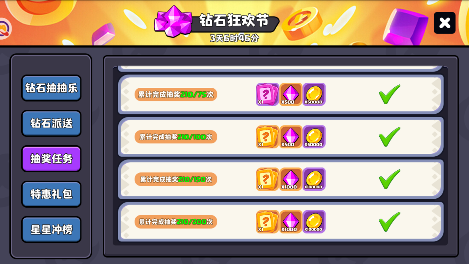 活动期间可花费紫钻进行抽奖,每次抽奖需花费150紫钻,每轮共有15个奖品,奖品不会重复!!!当15个奖品抽取完将开启下一轮,抽到星星可以一次性拿取所有奖品哦~(集齐4颗星星之后可以自选金卡奖励哦~)