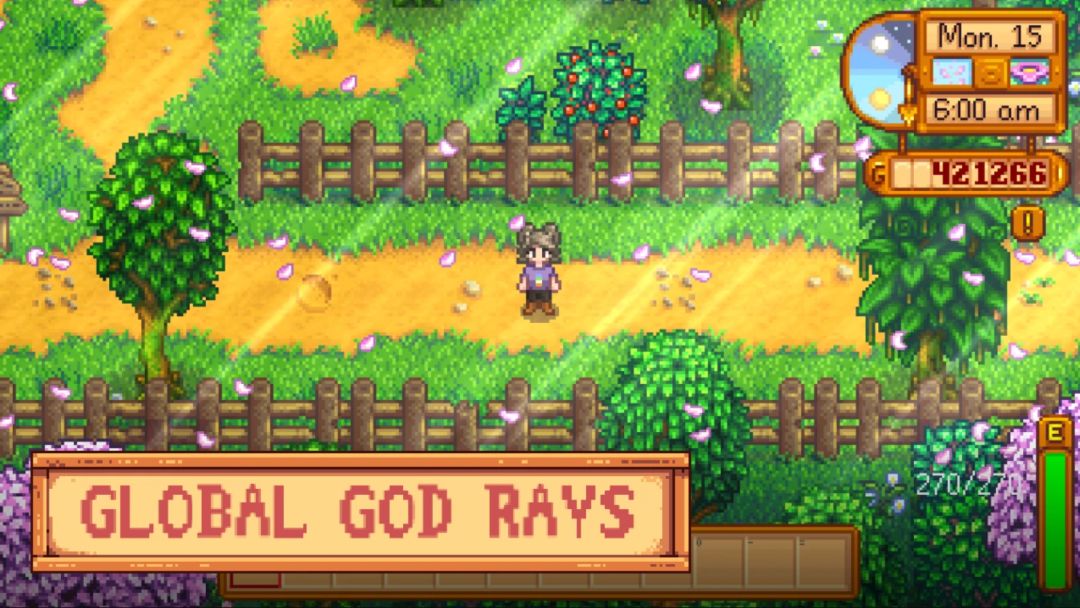 《星露谷物语》迎来首款光影模组,为经典田园世界增添全新沉浸式视觉体验。这款模组核心为游戏全户外场景解锁华丽光束效果,光束效果极具动态感,全程跟随游戏内太阳实时角度在白天不断移动,不会固定静止。临近日落时段,光束还会同步变换色彩,渲染出满满的黄昏氛围感。等到天色彻底变黑,光束便会慢慢渐隐直至消失,完美贴合游戏昼夜更替节奏。