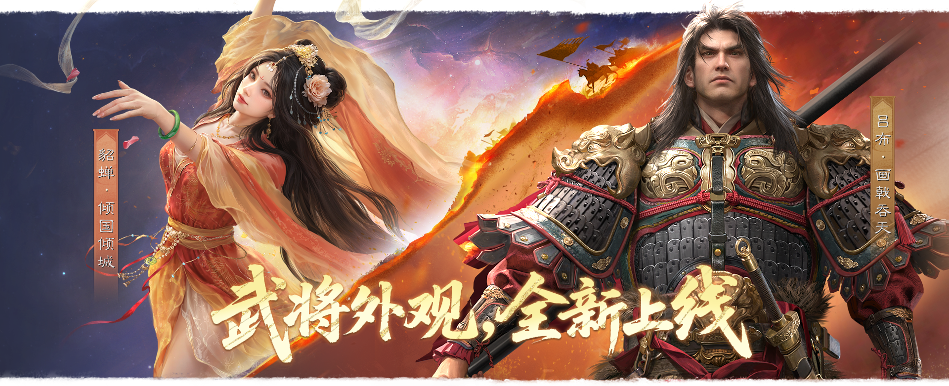 全新武将外观「画戟吞天·吕布」与「倾国倾城·貂蝉」将于12月26日10:00正式上架游戏内外观商店。