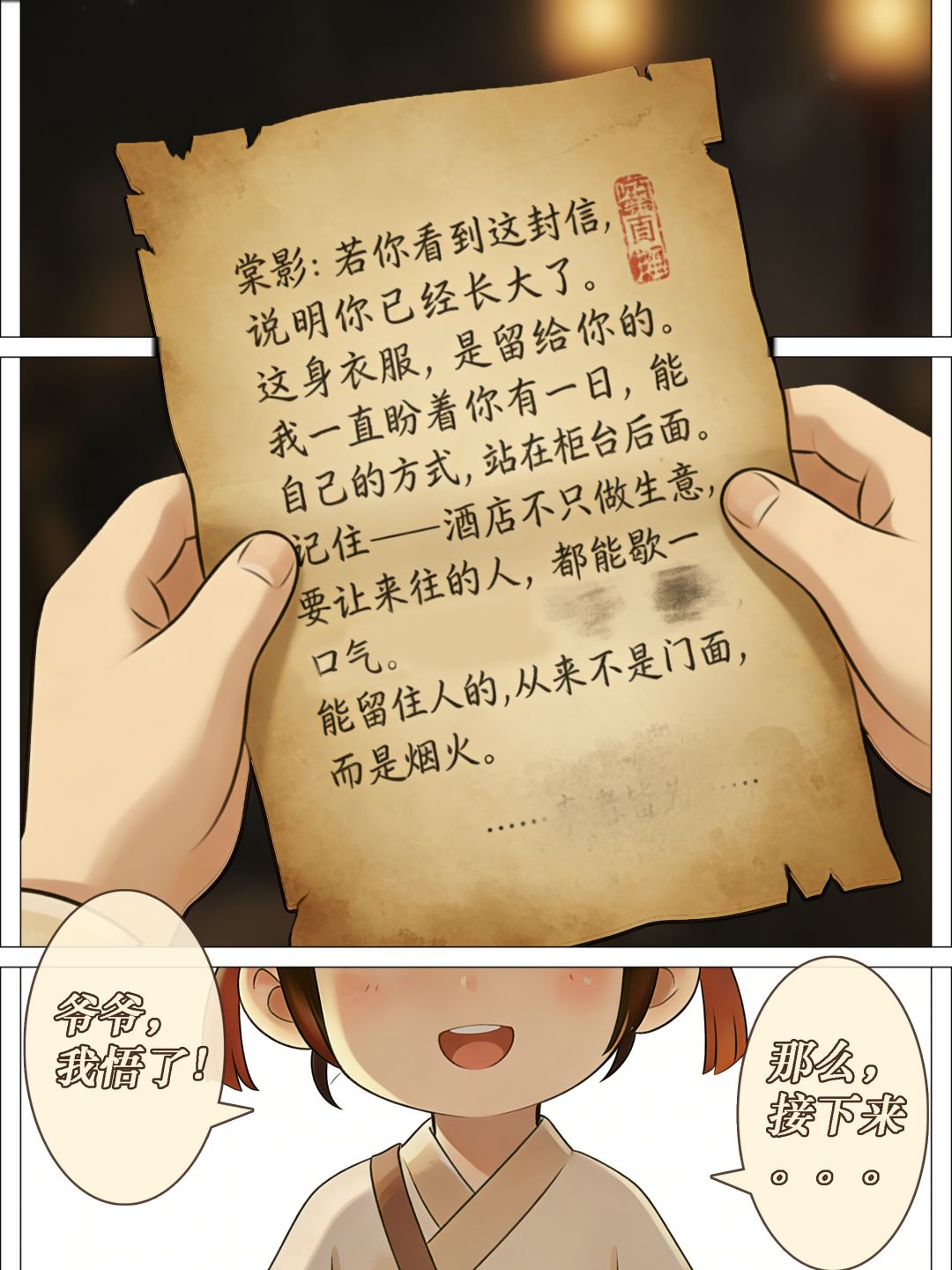 被店员赶出来后,我没有立刻离开。不是不想走,只是忽然不知道——还能去哪里。🌧️。 蹲在墙角🌿的时候,看见一个普通旅人想进店,却被拦在门外🚪❌。那一瞬,我才真正意识到:爷爷的店,是真的不在了。 正当我听着街市的喧闹声发呆时,酒店侧边传来低低的说话声: “大哥,你倒是喝快点啊,仓库这灯我够不着!” “你急啥啊!” 话音一落,我心里猛地咯噔一下。“仓库” 两个字,像被谁轻轻推了一把,忽然间勾起了模糊的记忆。 街市很吵,我却跑得飞快🏃,穿过弯弯曲曲的巷子时,心里只剩一个念头:如果还有什么被留下,我一定要找到。 后院还是老样子,砖没换🧱,木桶也没换,只是太久没人打理,墙角爬满了青苔🪨,透着股沉寂的旧味。 我蹲下身,试着翻开石桌下,那几块熟悉的地砖。其实连我自己都没底,这么多年了,还会有东西吗?只是下意识地,想再试一试。 箱子打开的那一刻📦,我愣住了 —— 里面是一套从没见过的衣服👘,还有一本泛黄的酒店账本📜。心里满是疑惑:是谁放在这里的?这里明明就我知道才对…… 账本翻开的那一刻,一张折得整整齐齐的纸掉了出来。 原来,有些准备,早就悄悄替我留好了。 我换上那身衣服, 站在院子里深吸了一口气。 如果旧的地方已经不欢迎我, 那就从新的地方开始吧。🚪✨。 #跑腿掌柜 #模拟经营 #漫画 #游戏剧情 #连载中