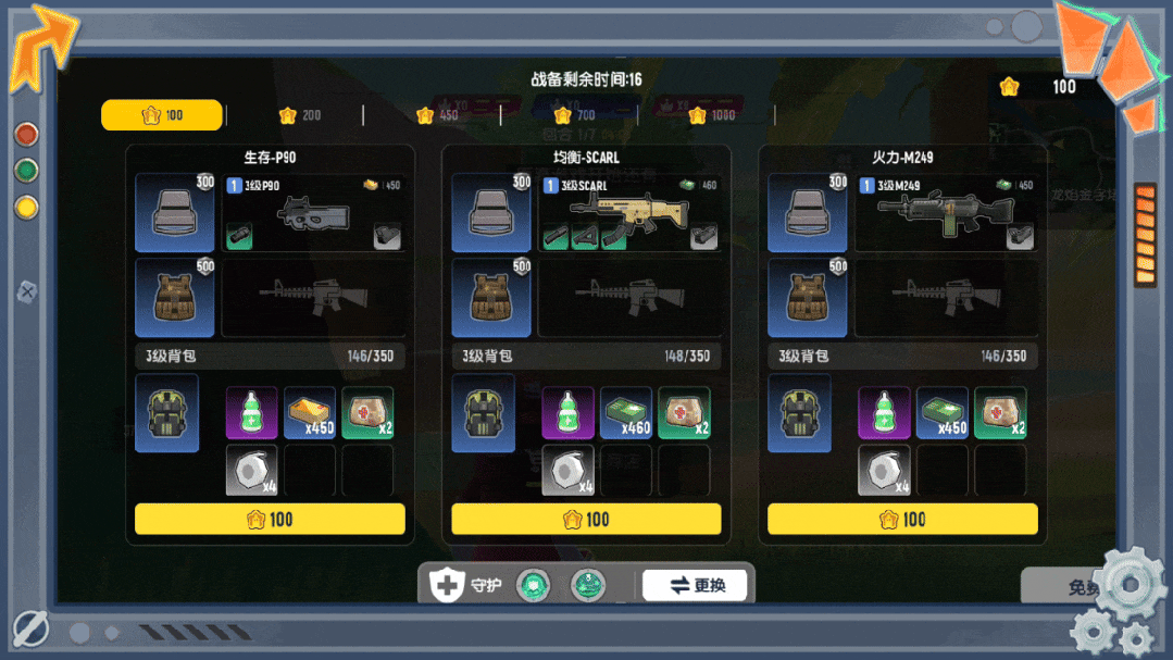 在每个回合开始前,肠肠可进入商店页面配置战备,商店内提供多种战术套装,肠肠可使用积分购买心仪的战备套装