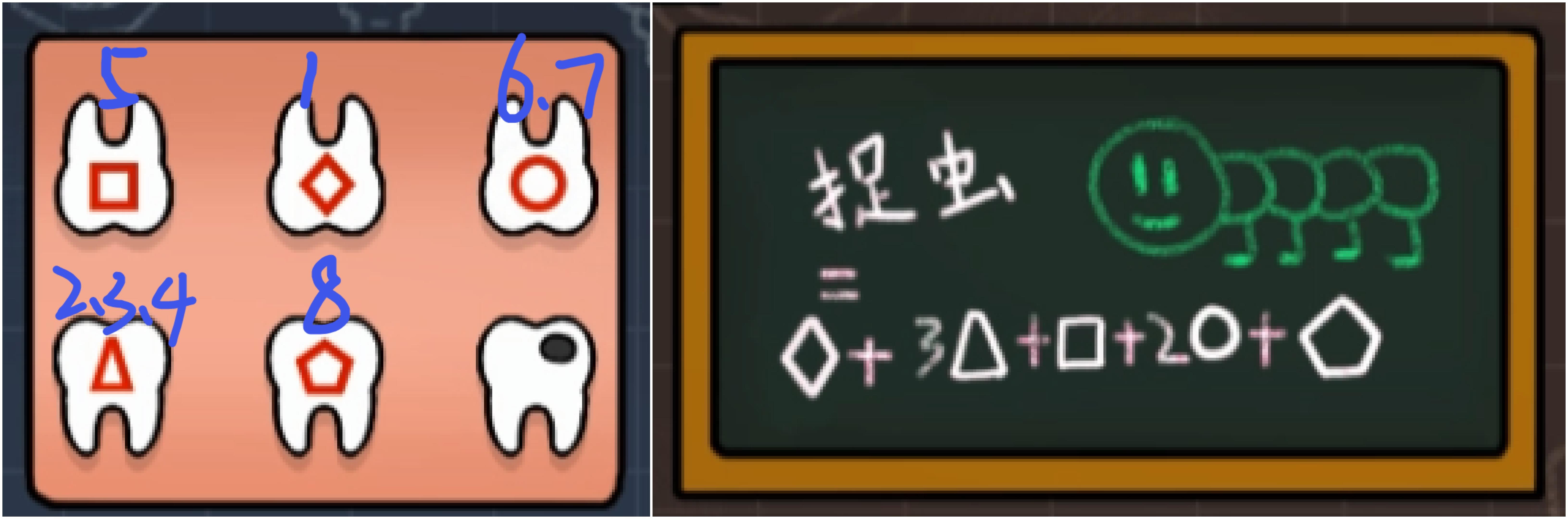 7.解开骰子平面图谜题(图11),得【黑板擦】。【黑板擦】擦「人6」中黑板,解开「人3」中牙齿谜题(图12),得【放大镜】。【放大镜】放大「人5👮」右下角符号板,解开符号密码(图13),得【贝壳】。