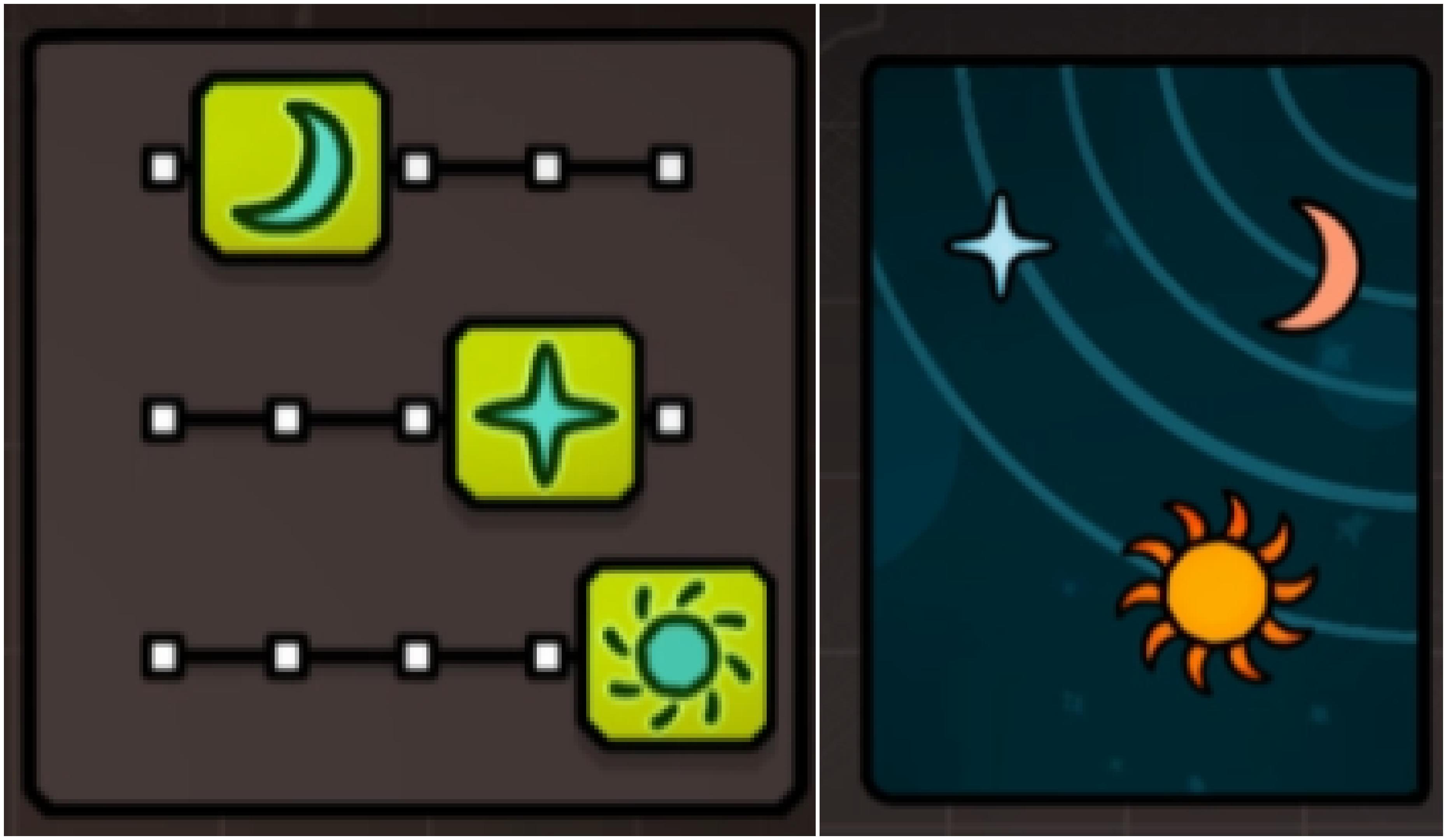 6.解开「人6」日月星谜题(图9),得【小刀】和「人物卡7」。玩进球小游戏(图10)得【指针】,【小刀】切开苹果,得「人物卡8🤖」,将【指针】安在表盘上。