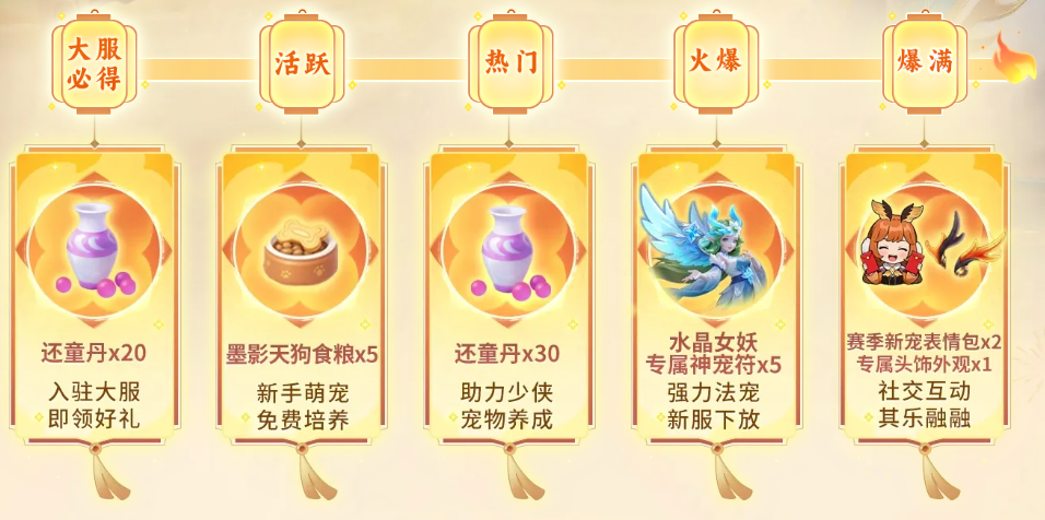 还童丹*50,可成长萌宠墨影天狗培养道具*5,强力法宠水晶女妖专属神宠符*5,千幻灵蝶表情包盲盒*2,限时外观“晨曦鹿鸣”头饰。