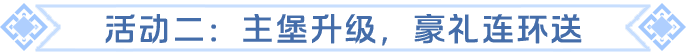 开服后,主堡达到每个指定等级后可立即获得英雄邀请函、秘焰晶核、丰产币等珍贵道具,首个达到15级的领主可额外获得2000龙币。完成限时挑战,在开服10日内主堡等级达到15级的领主还可免费激活30天黄金月卡!