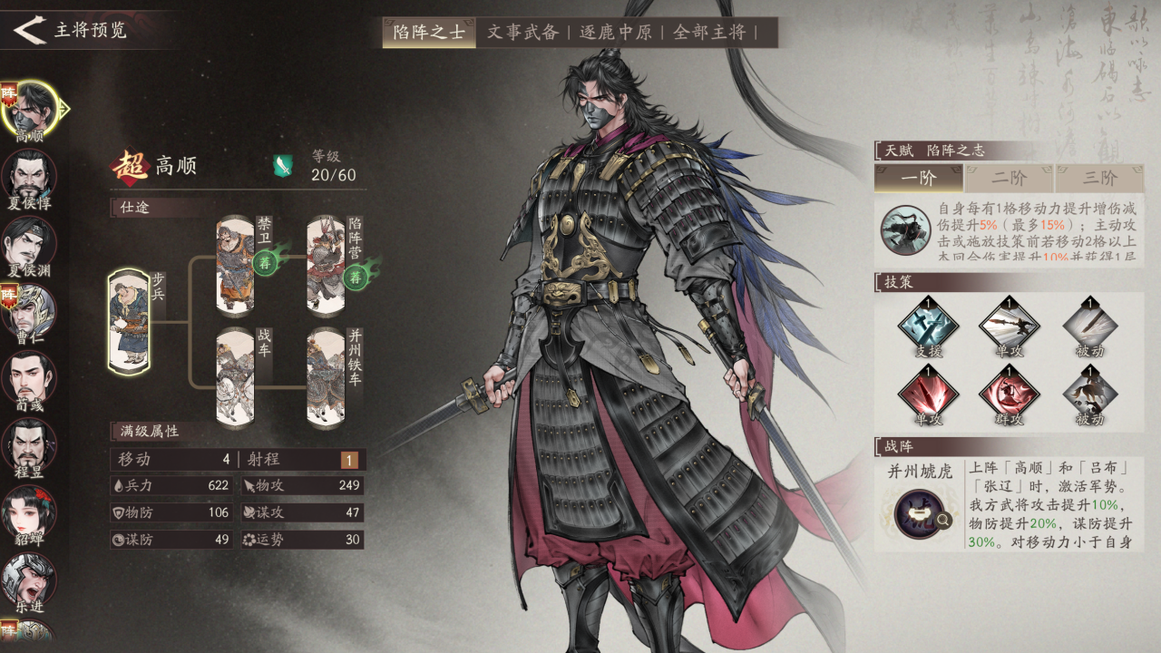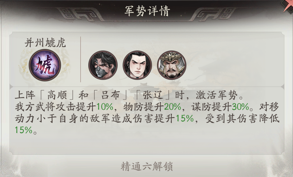 高顺是拥有阵眼的超级别短兵/骑兵系主将。可与吕布和张辽激活军势【并州虓虎】,提供攻防增益之余,对移动力小于自身的敌军造成伤害提升15%,受到其伤害降低15%。