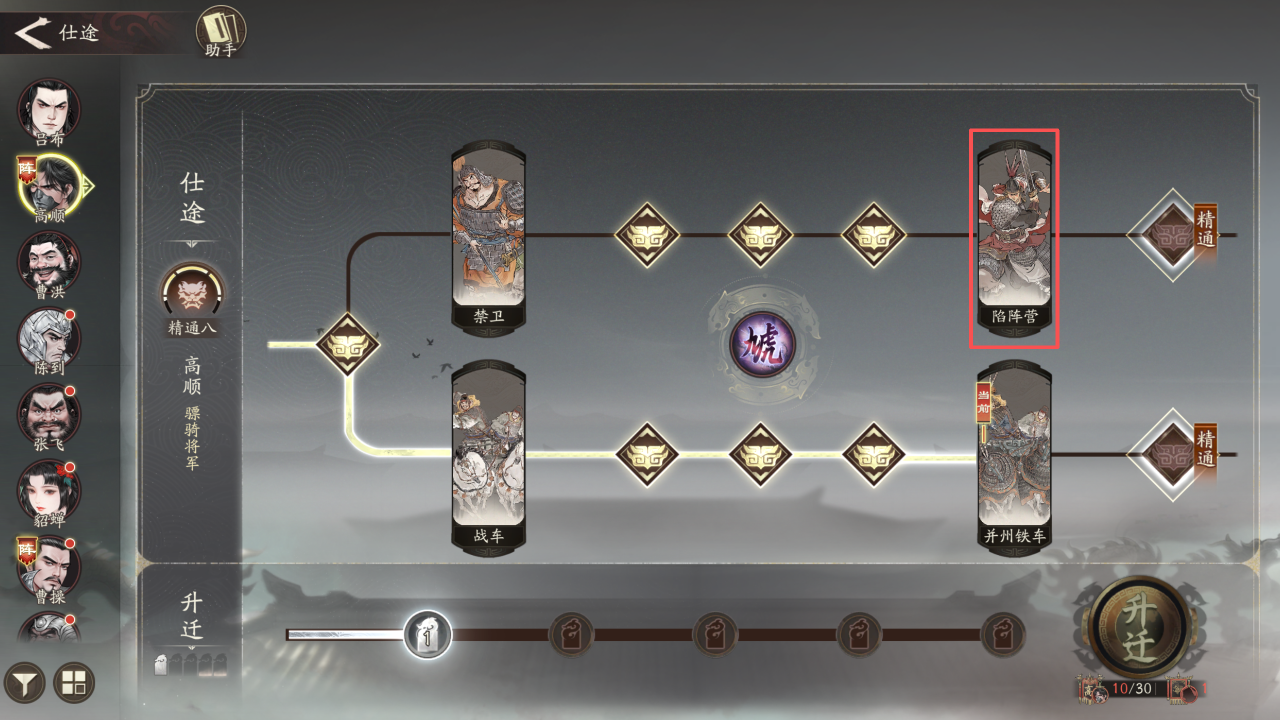 在仕途进位方面,建议明公首选【陷阵营】。可解锁技策【攻无不克】【双持】,技策攻无不克,造成伤害的同时,可将敌军击退 2 格;若攻击前移动 2 格以上,伤害前额外使敌军被动技策失效,效果持续 2 回合;若攻击前移动 4 格以上,敌军击退距离将从 2 格变为 3 格,同时本次攻击无视敌军 30% 防御。