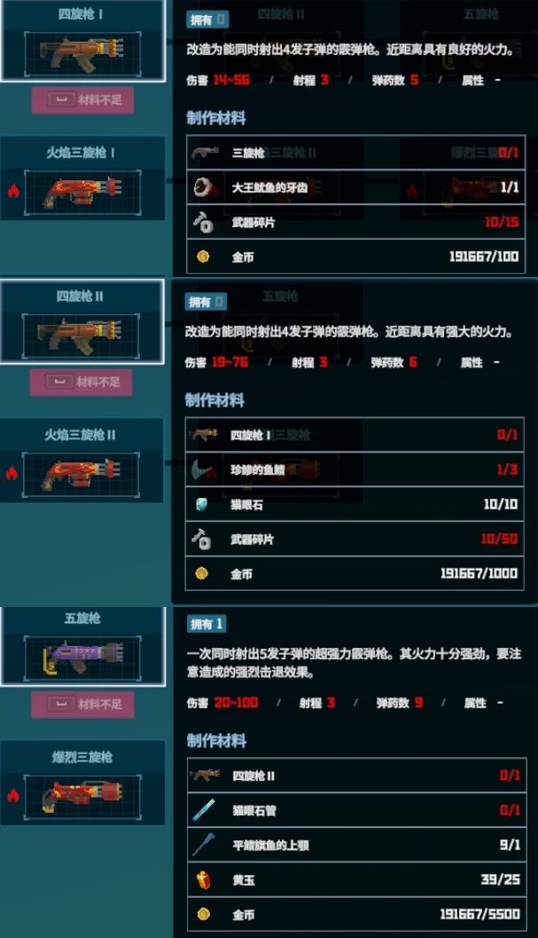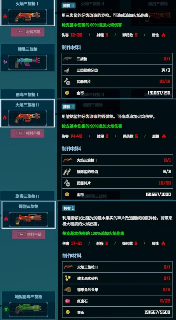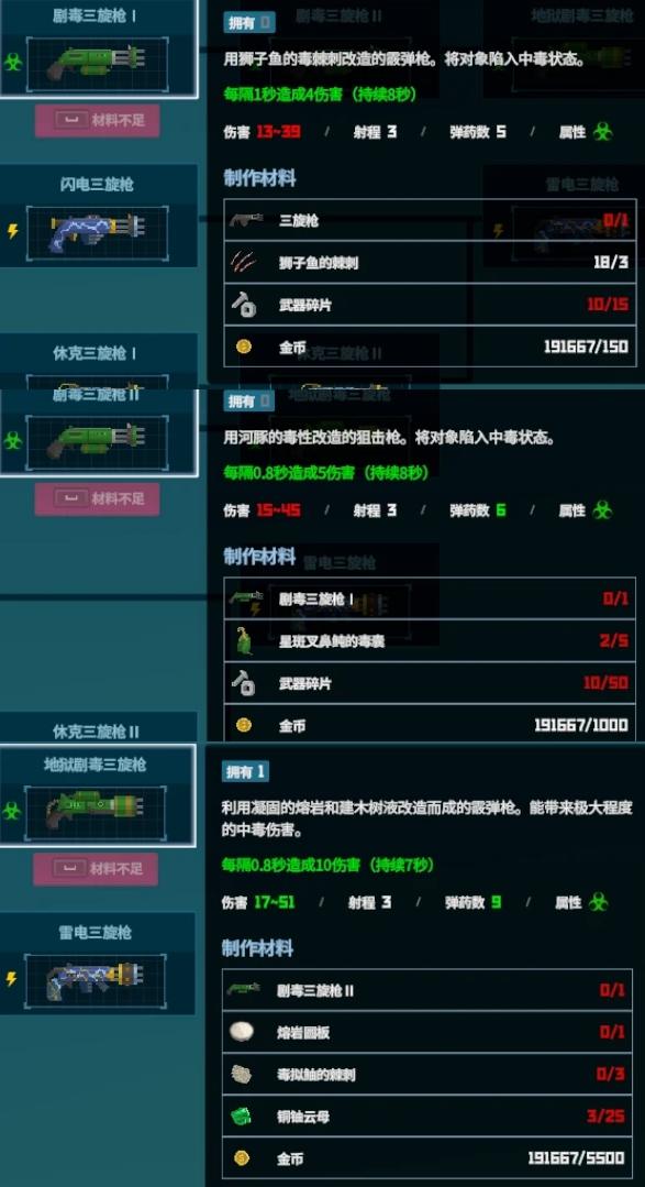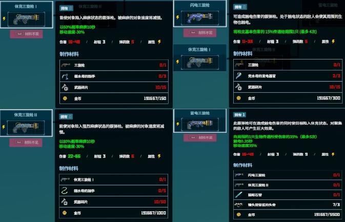 大家想要全收集的准备6把枪,虽然说只有五个分支,但雷电那一支要做两把二合一,另外,网枪和飞镖一个就够,都只有一个分支