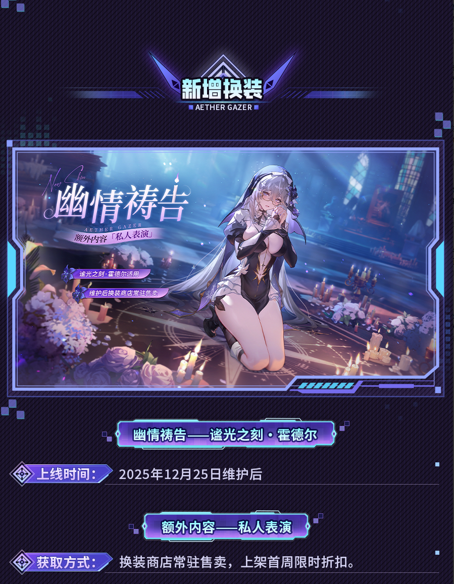 - 幽情祷告·雷霍时装 修女主体 未来会有更多的主体皮肤(没错从圣诞节贺图可以看出是帕瓦) 大家懂得都懂 我就不多说什么了 游戏里自行体验(皮肤介绍说是演话剧的演出服)