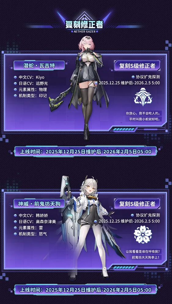 本次更新带来了一位新角色 一位老角色同调 及两个限定池复刻