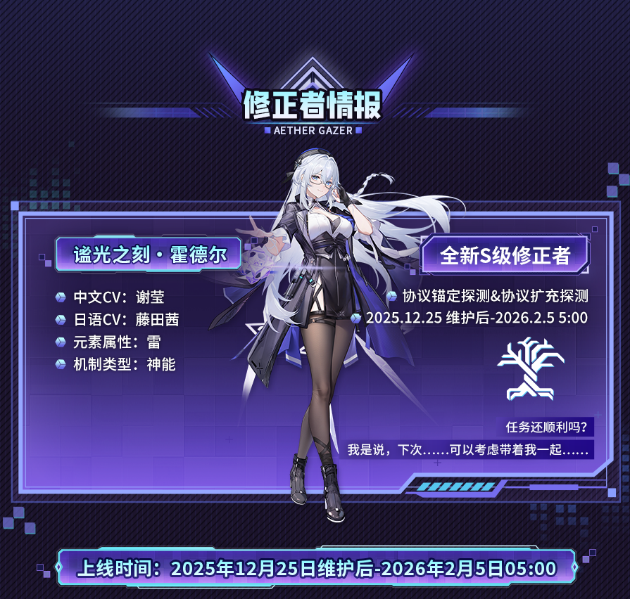 - 谧光之刻·霍德尔 需要抽取 新时代全能型雷系角色 可C可辅 操作流程相对固定 如果想要良好的操作体验 需要专武进行补强 需要与神鬼连携 没有神鬼需要诗蔻蒂单挂 队友没有成型雷队的玩家较为推荐