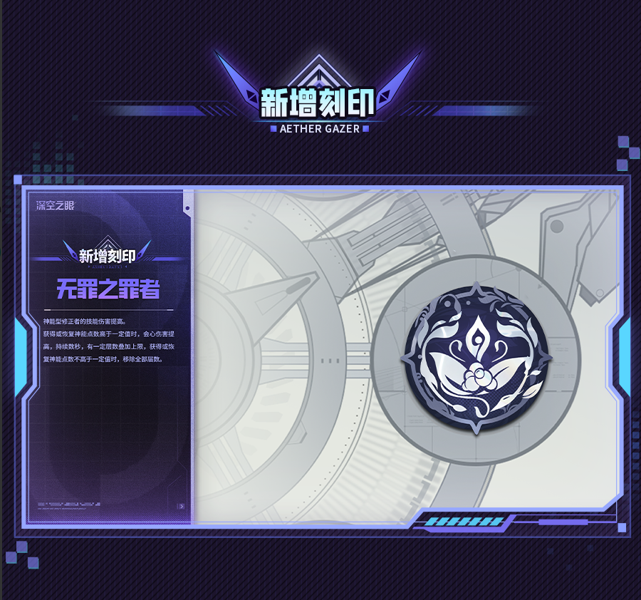 - 新刻印 无罪之罪者(那么到底是有罪还是无罪) 位置246 神能系新刻印 神能伤害+10% 最多可以叠加40%的爆伤 (但是新刻印触发增伤机制较为特殊 现阶段只有部分神能系角色可以携带 爆伤叠加需要恢复/获取神能大于10点 小于10点且未满则移除增益 因为神能系角色 大多数都是通过普攻获取神能 而普攻获取量往往都低于10点所以大部分角色很难满层就会断掉 )(现阶段完美适配的角色 包含水海拉 黄线金乌 及雷霍 注意水海拉不能普攻获取少量神能断BUFF 金乌不能红线因为会自动恢复1点神能断BUFF)