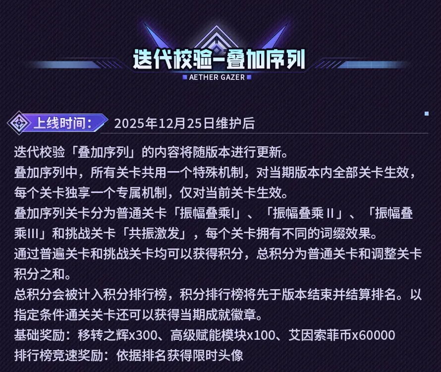 - 迭代难度本 进行改版更新 从上个版本通关双小怪 获得词条 自定义BOSS词条挑战 改为四队协同通关 三关小怪关需要纯属性队伍3选一 而BOSS需要纯属性雷队通关 难度相较往期的迭代难度本 难度降低 但是队伍需求数量增加(这里要说一点 奖励姐虽然有三樱雷配队 但是组队过程中判定仍为物理角色 需要酌情更换)