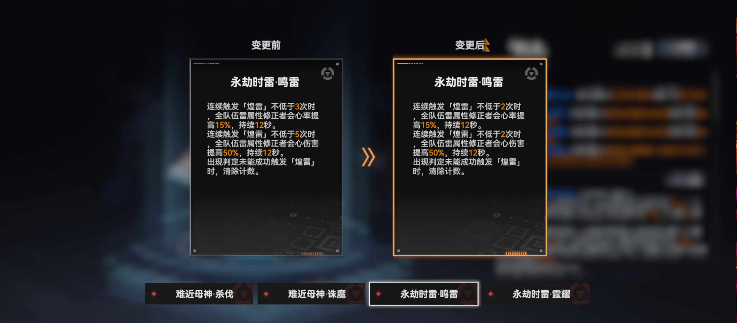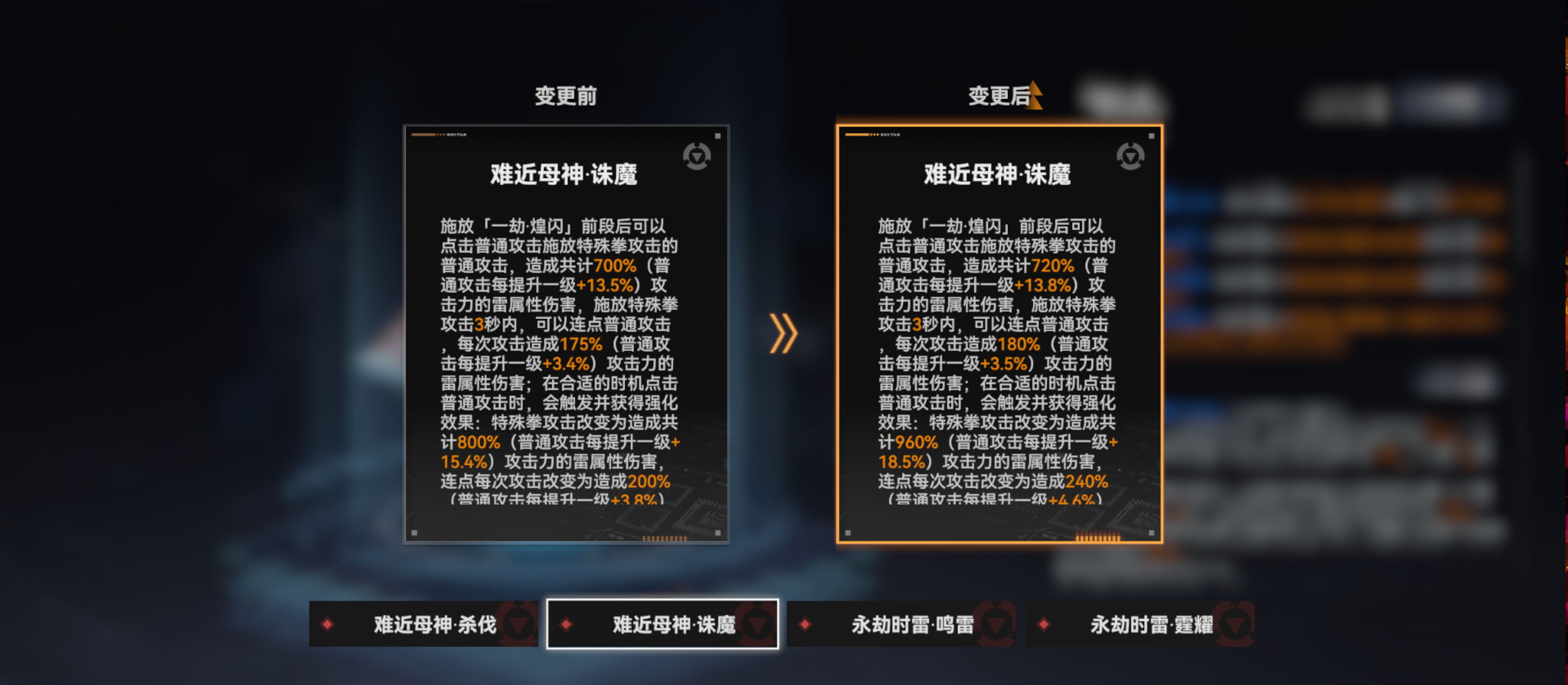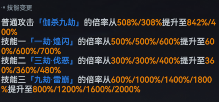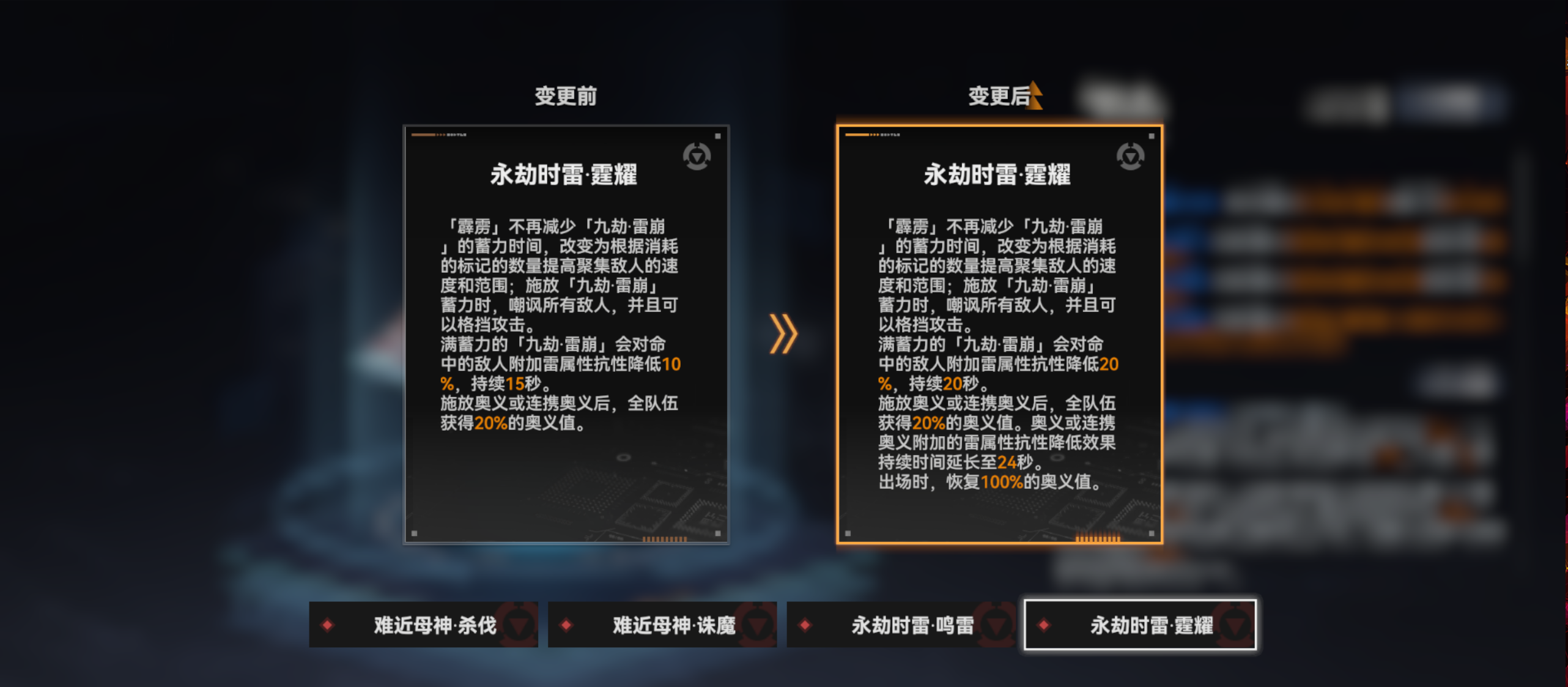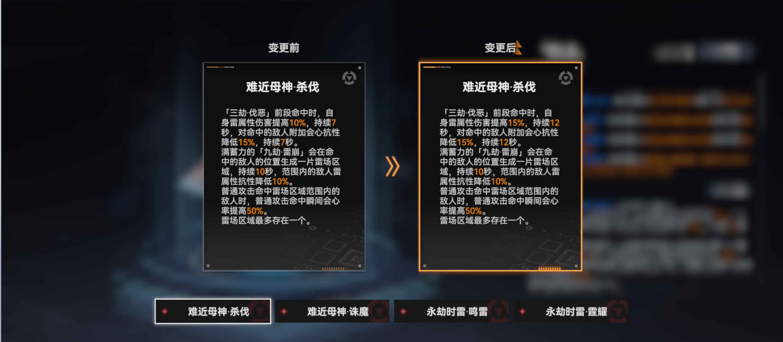 神格变更 2技能命中自身雷伤+10%=>2技能命中自身雷伤+15% 持续时间7秒=>持续时间15秒