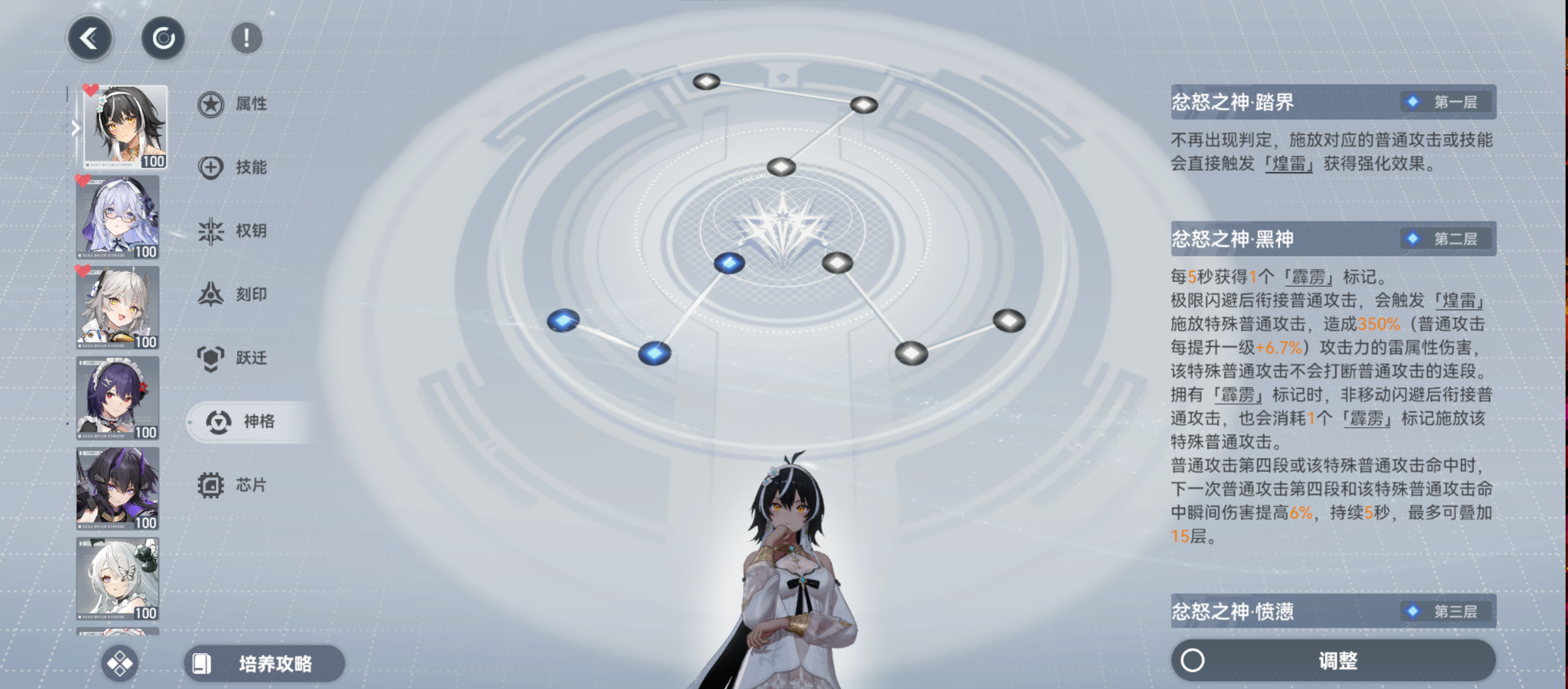 总结:极致的雷辅神格 在连招的同时增加全队的雷伤 暴击 爆伤 并附带一个大范围聚怪技能(跟庚辰范围类似 这里因为聚怪附带格挡效果 但是因为格挡刻印跟伴影增益差距不大 还是选择怒气获取更优的伴影)