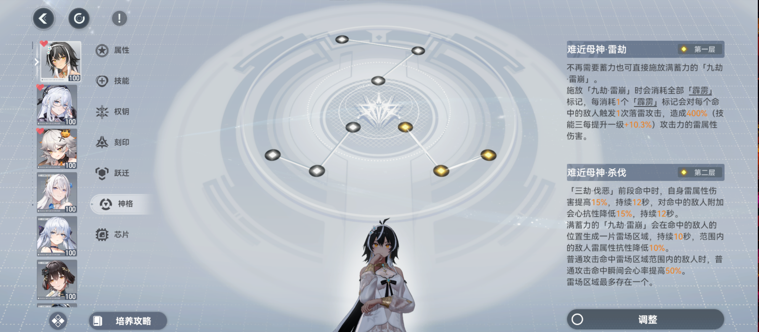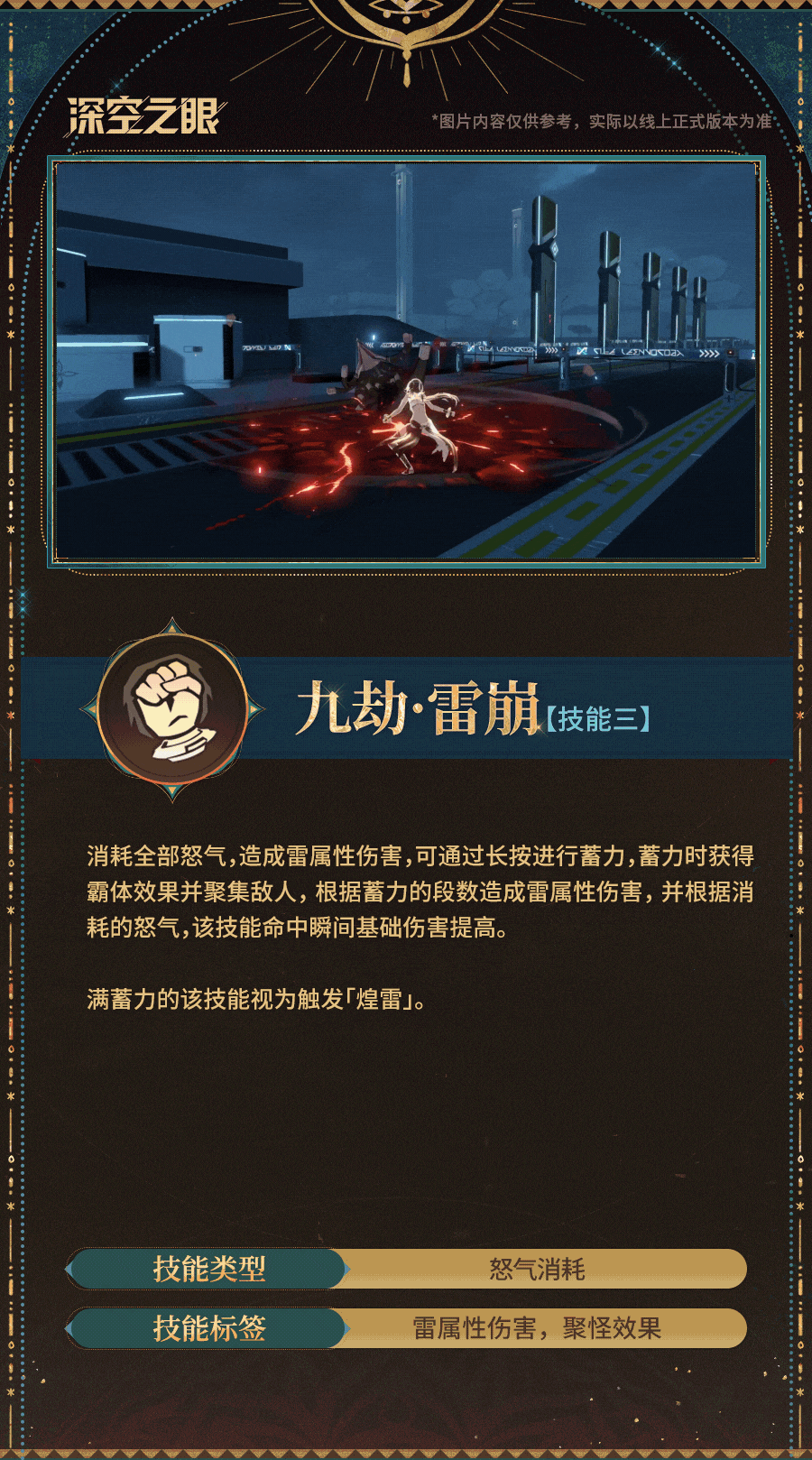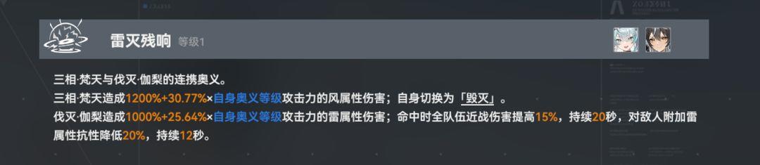 - 2技能前段命中自身雷伤+15% 对敌人附加暴击抗性-15% 3技能会生成雷场 雷场内敌人雷抗-50% 普攻命中雷场内敌人普攻暴击率+50%