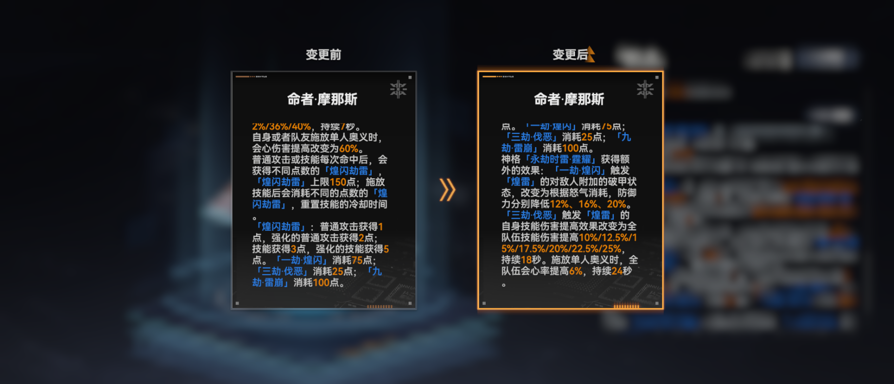 奥义获取率增加 全队增加一个生命值上限护盾(两条命了) 每次释放强化技能/强化普攻全队攻击力增加 奥义被动爆伤30=>60 普攻/技能获得圆环被动条 释放技能升级消耗相应被动条重置冷却红线可以根据消耗的怒气额外获得破甲 强化2技能全队技伤增加 释放单人奥义全队暴击率增加(升级专武只增加强化技能/强化普攻的全队攻击力 其他不变)