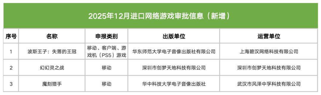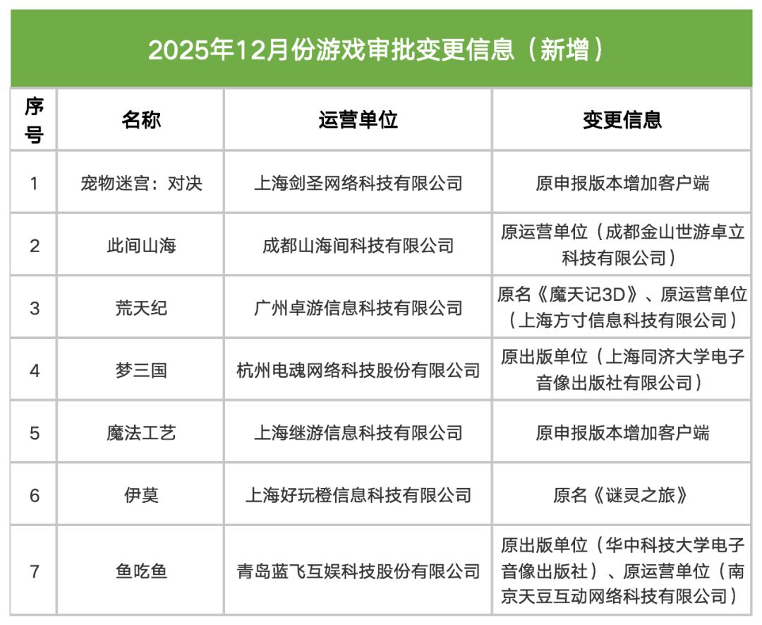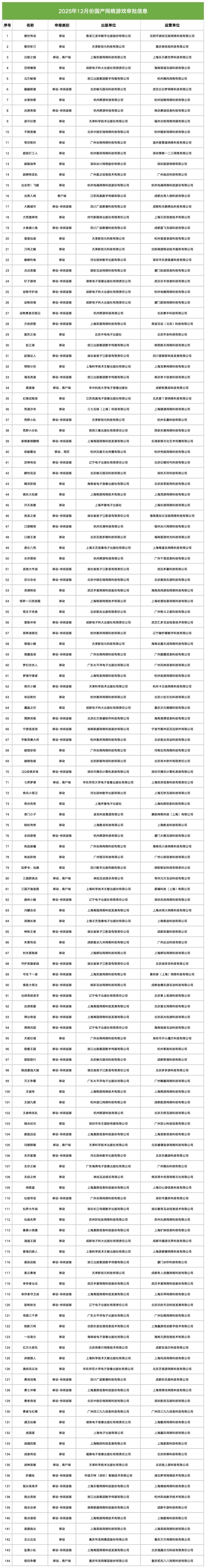 今天(12月25日),国家新闻出版署公布了12月国产网络游戏审批信息(144款)、新一批进口游戏审批信息(3款),以及审批变更信息(7款)。