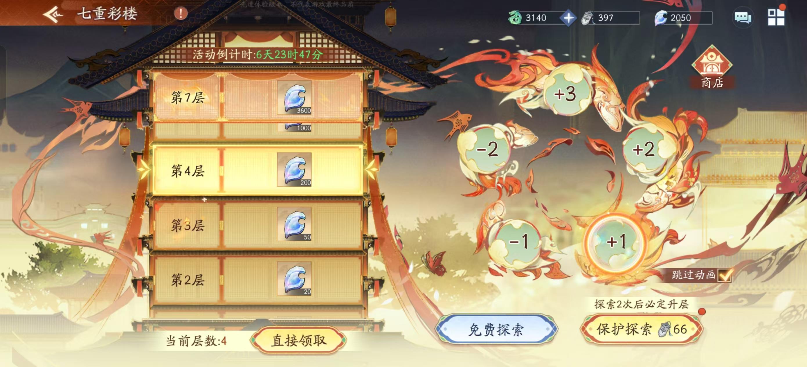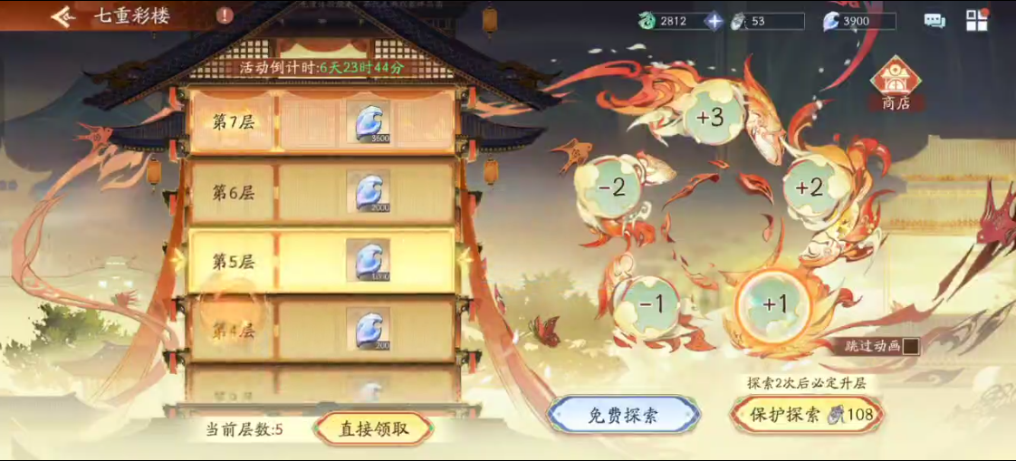 (2)免费探索后,如果升层则可选择领取该层奖励或继续探索,若降层则仅可选择领取降层后的楼层奖励(最低第一层),领取后层数重置。