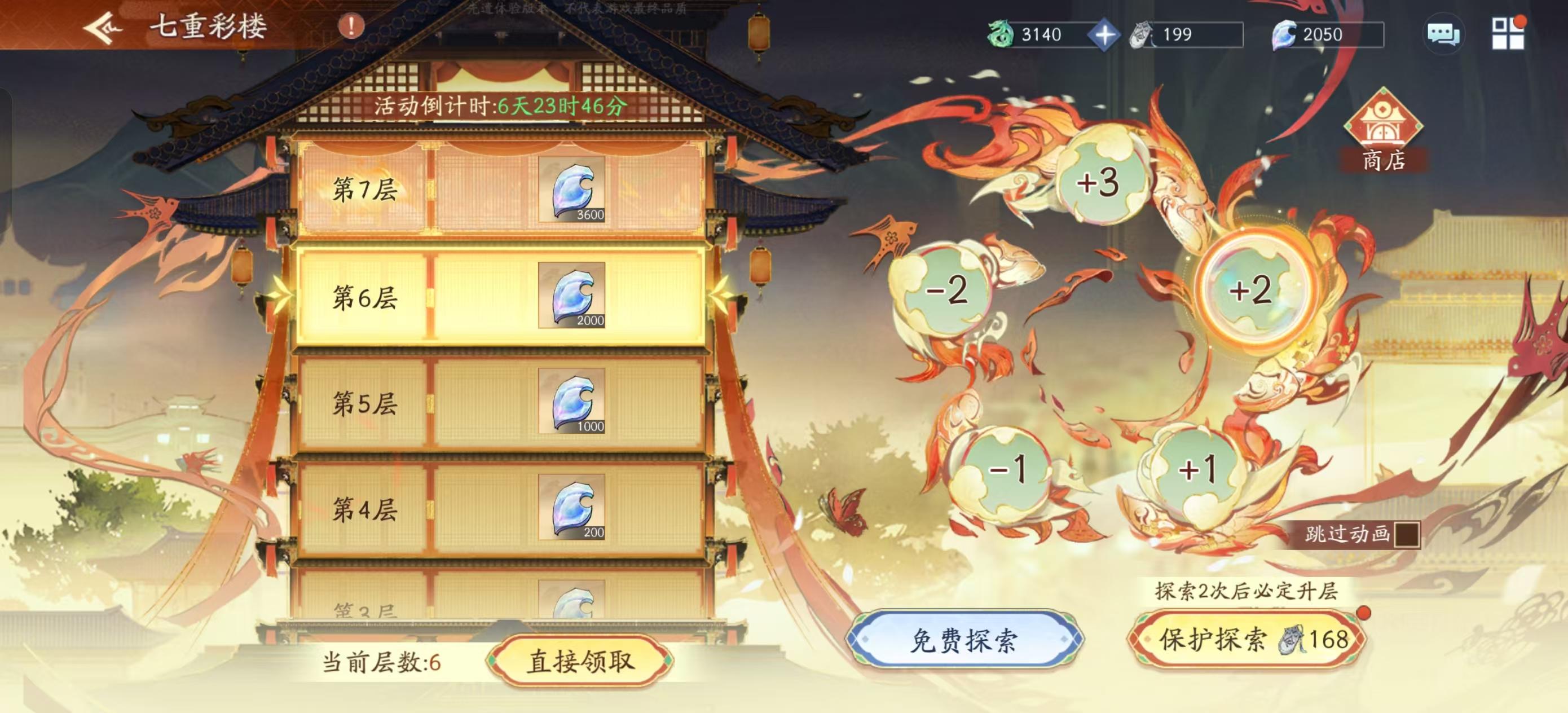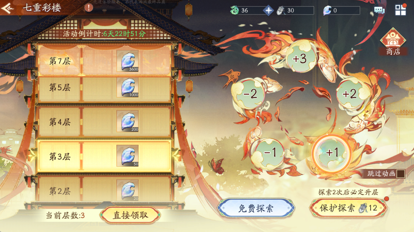 第三层:抽中【升1层】,测试样例【免费探索】(仅供测试样例),另:【保护探索】需继续消耗【登楼令】*12,且探索2次后必定升层