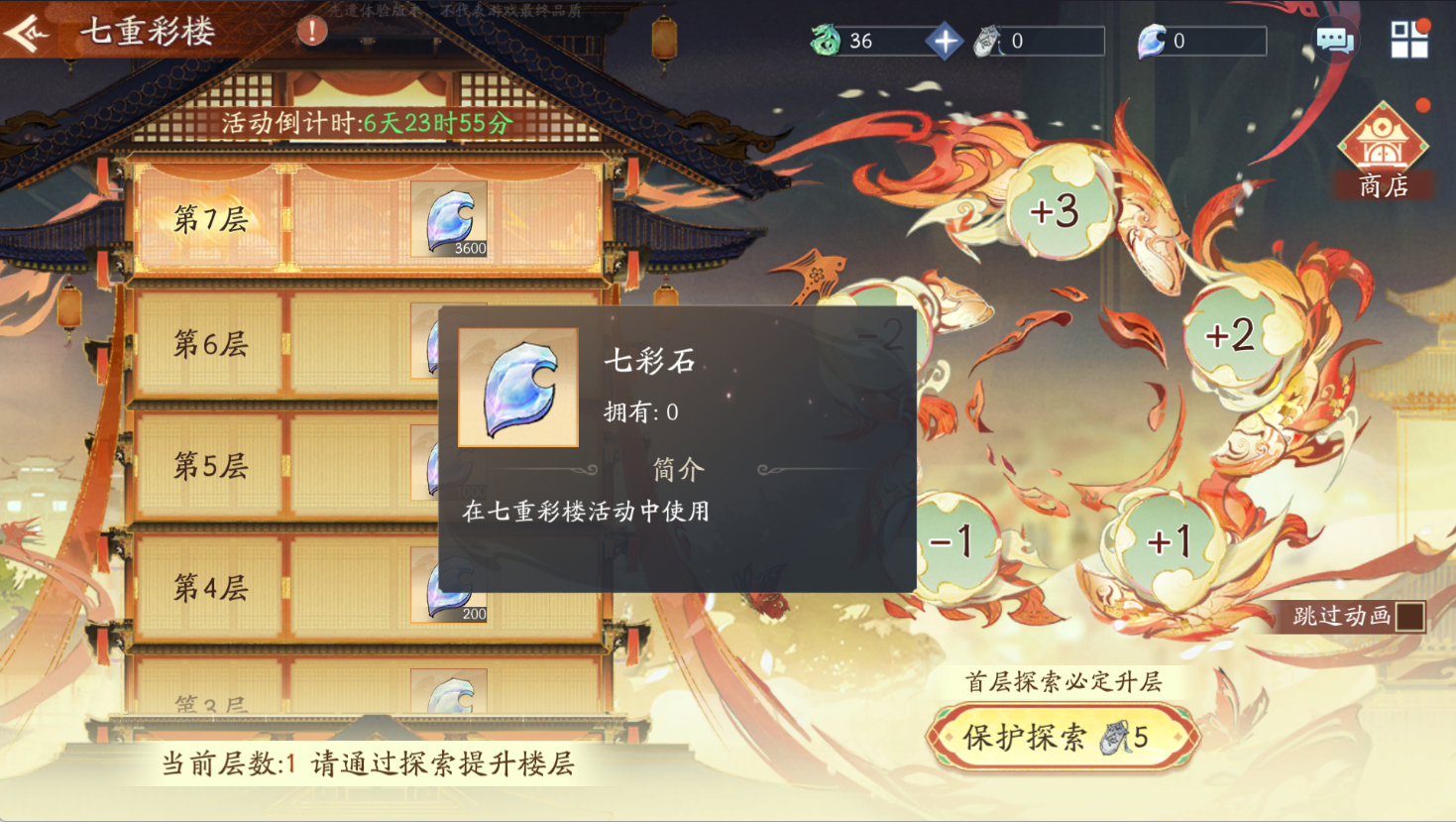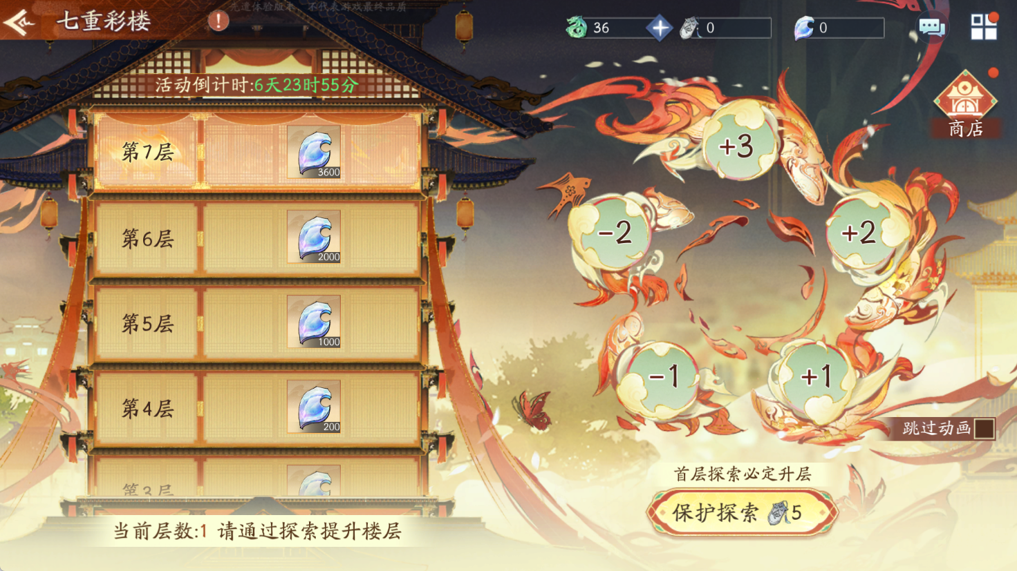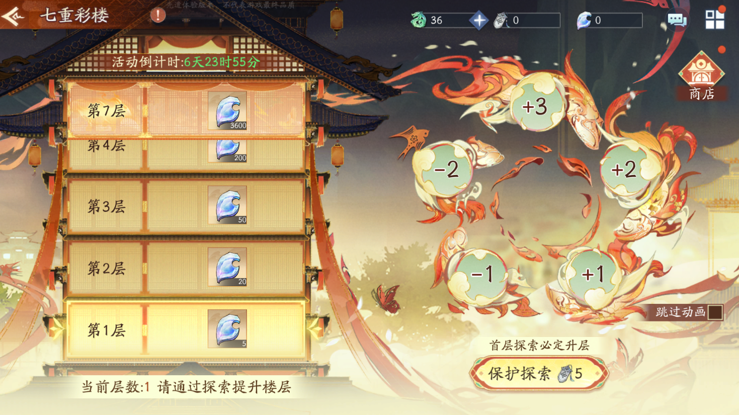 第一层:只能【保护探索】(消耗【登楼令】*5),无法【免费探索】