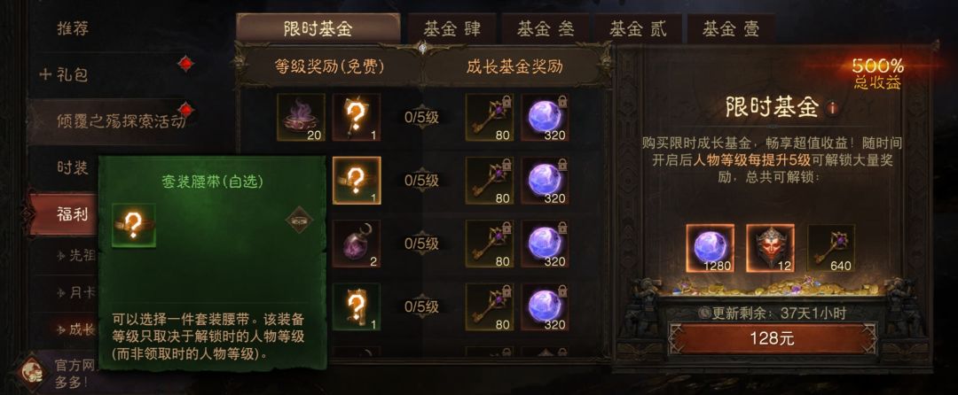 :无论是限时基金还是前面的成长1234基金,这个不用等后期,你什么时候能领就可以什么时候打开,成长基金里送的装备,等级都锁死了,不会随你成长,即便有,也是一点点,没必要压,可以能领就直接用。我把上面能随自己等级成长的神秘打开了,结果成长基金里,不会成长的我一直压着不敢拿,到最后拿出来……王德发!!!