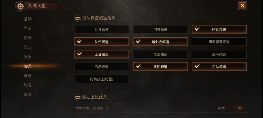 :让你的游戏界面清爽,有些频道不要打开显示,会干净很多,暗影会的频道,可以根据自己需要开关,一般我只有在有组队需要时才打开,平时都关的,世界频道要关,打广告刷屏的太烦了!