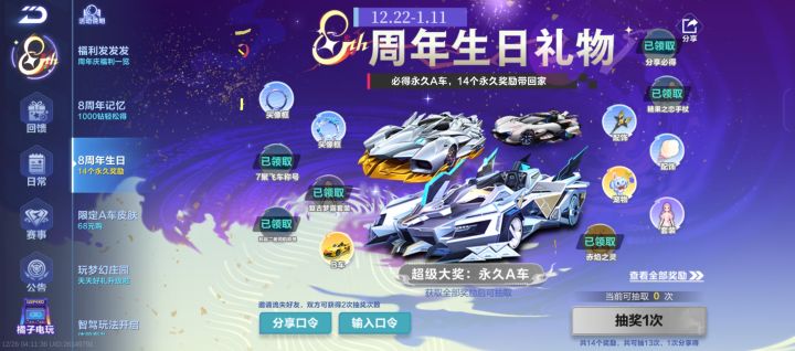 《QQ飞车手游》周年庆典邀您回归!星穹雷诺全套系免费送、1000钻石全民得,友情口令:pndcx9,复制前往【活动】领取永久A车!
