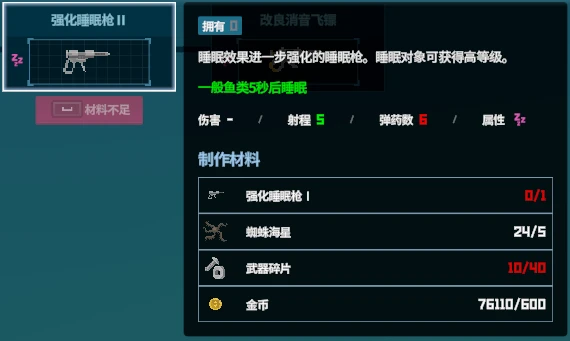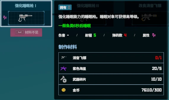 消音飞镖也只有一个强化分支,升到最终阶段是绝对的神中神,一发秒睡小鱼,两发睡大鱼,睡完全部打包打走,没有什么是一发睡枪不能解决的,如果有就两发(螃蟹、青瞻星鱼除外)