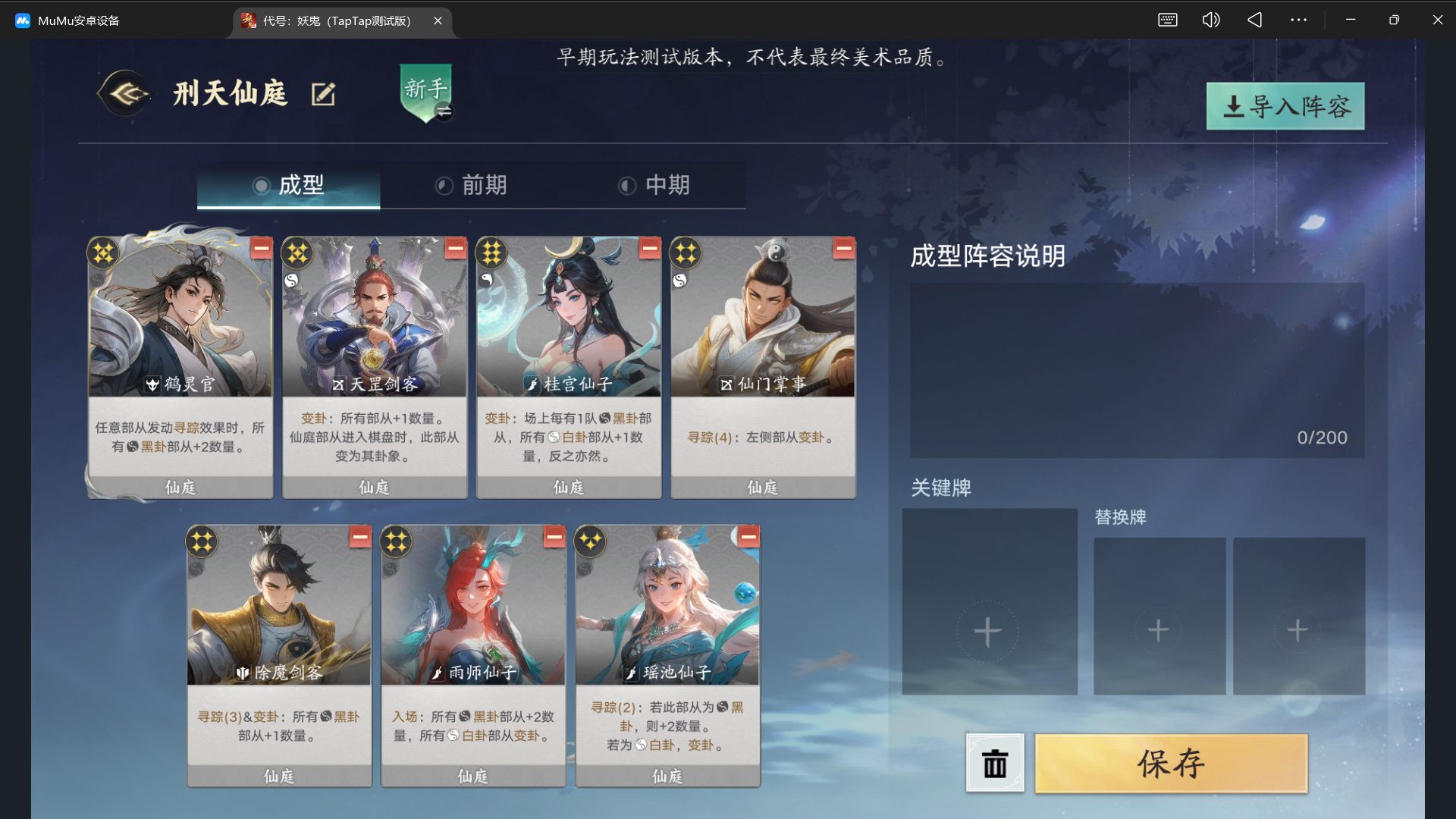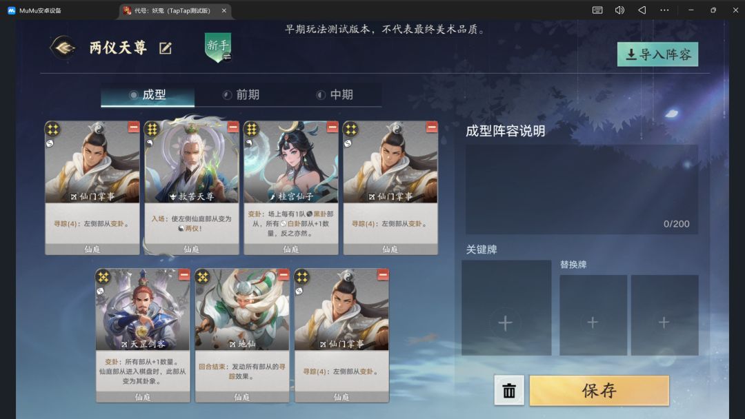 依旧是老两样,掌事和桂宫提供成长,用多余的天尊将全场变成两仪,天罡剑客可以不要,我们C救苦天尊,如果多桂宫,可以上个地仙用来让每个掌事回合结束变卦桂宫,掌事依旧是最好卡进度,我们尽量只变卦金的桂宫(白的桂宫是当两仪格子用的)