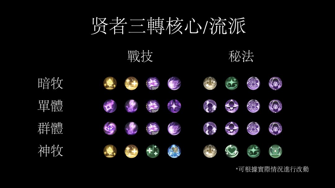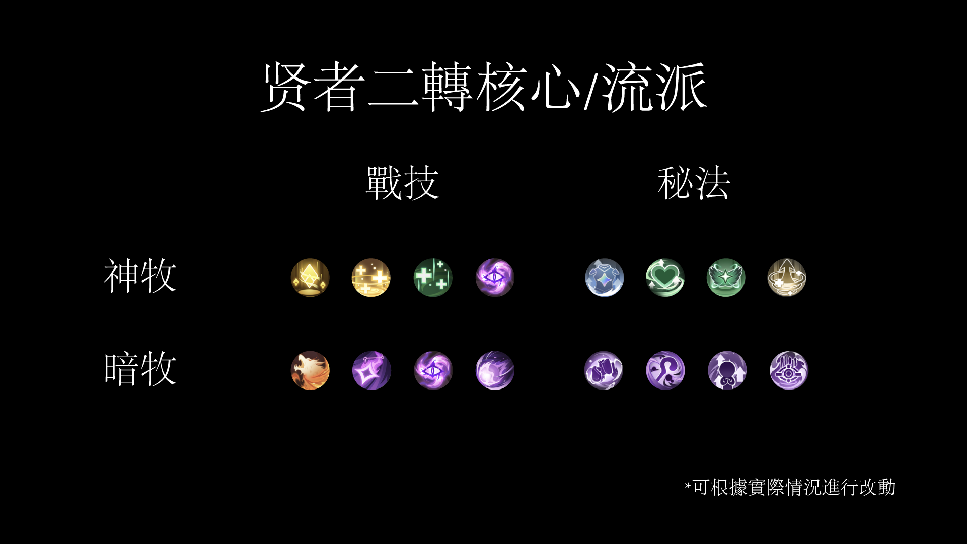 贤者二转技能只有两个流派:奶妈和暗牧。在副本当奶的时候建议最后一个技能带位移,可以保证回合结束的时候可以远离怪物避免受伤。玩输出的时候,有部分玩家会选择带减少召唤兽回合的秘法来让炎狼提前打出伤害。