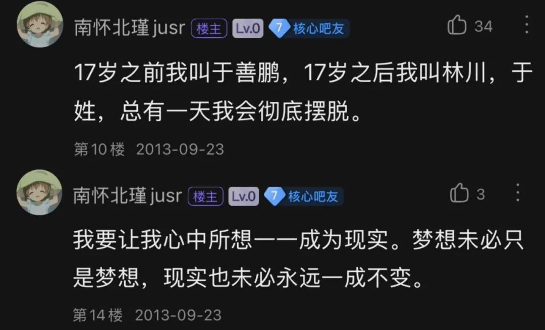 因为年轻的时候喜欢实名制上网,有个水友很早就发现了夜吹当年的贴吧账号。“林川”突然出现后,便把这些信息公布了出来。