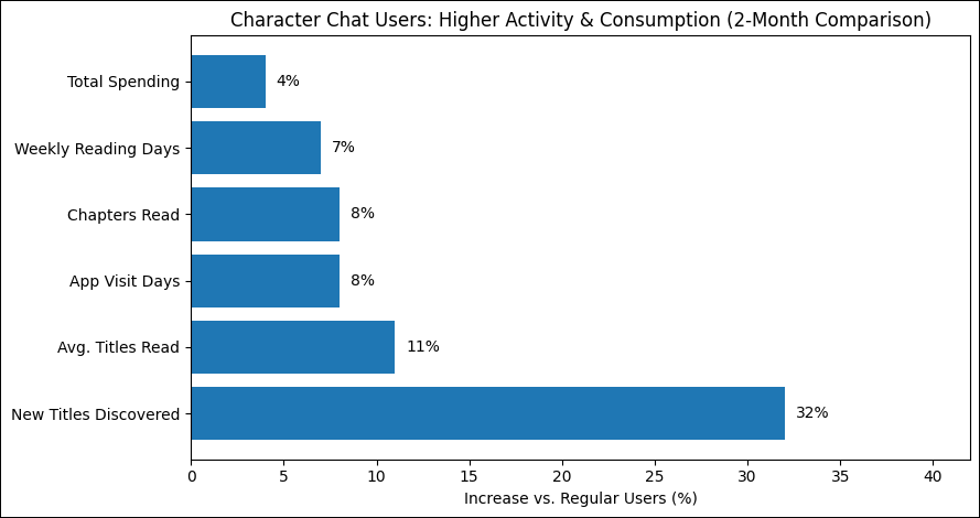 也有数据提到,参与 AI 角色陪聊的读者,不仅比普通读者更活跃,也更愿意花钱:APP 访问天数、每周阅读天数、人均阅读作品数、新接触作品数……差别都非常明显。
