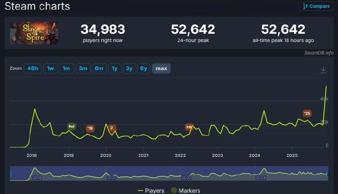 近日,人气独立游戏《杀戮尖塔》在Steam平台上的玩家峰值人数飙升至52642人,创下游戏发售以来的历史新高。