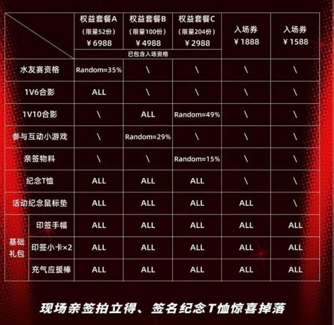 不同档位对应与Faker打水友赛、合影、玩互动小游戏等权益。值得一提的是,不少互动将通过抽签获取,哪怕买了最贵的票,也不一定有资格和Faker近距离接触。