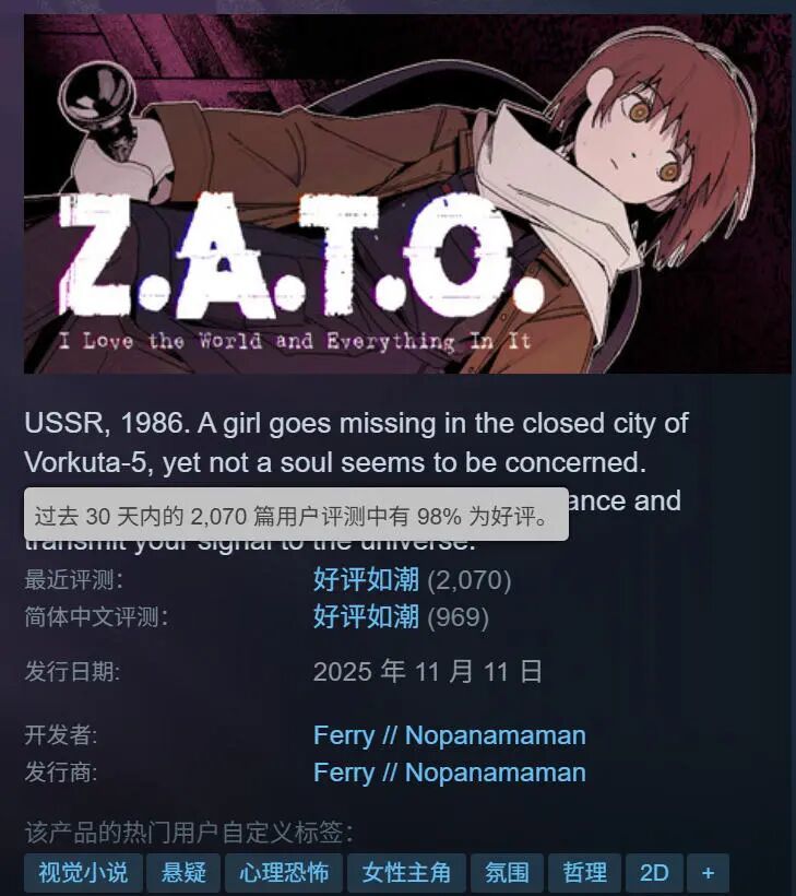 《Z.A.T.O.》是部视觉小说,从头到尾没有选项,所以你可以说它其实没有可玩性。但它又很独特,从其98%的Steam好评率来看,许多人都能认可它的独特。