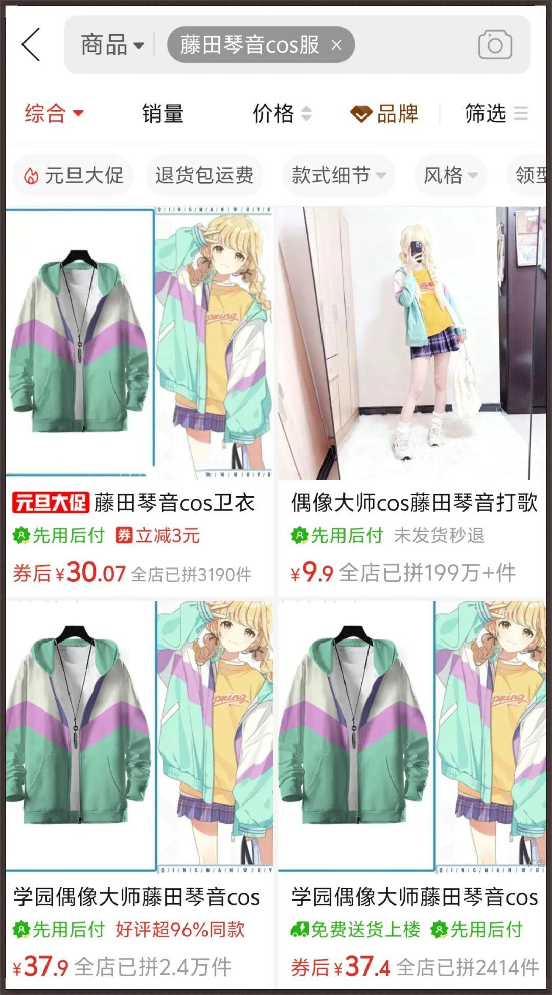 初始造型的“黄色T恤+白绿紫拼色卫衣”太过经典,淘宝和闲鱼上也有不少商家售卖野生的藤田琴音COS服套装。
