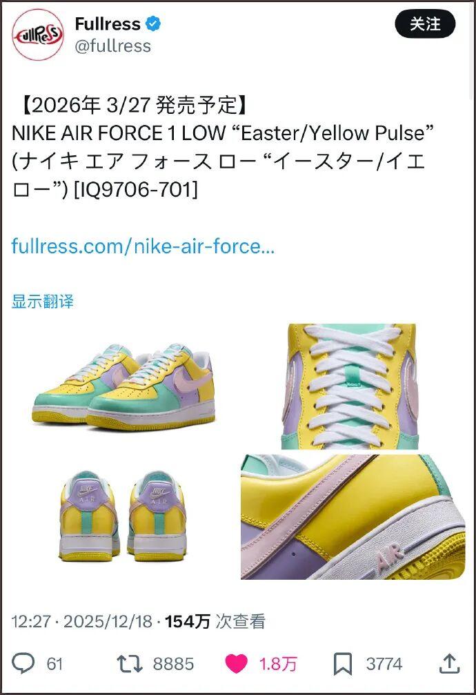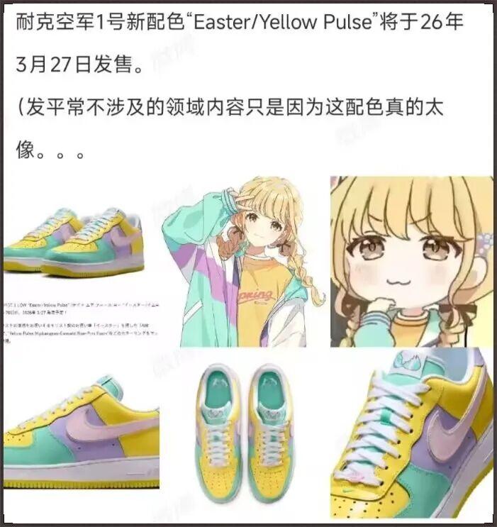几天前,Nike发布了一款新鞋的预告,宣布将于2026年3月27日推出空军1号的新配色“Easter / Yellow Pulse”,以庆祝复活节。(价格通常在¥899左右)