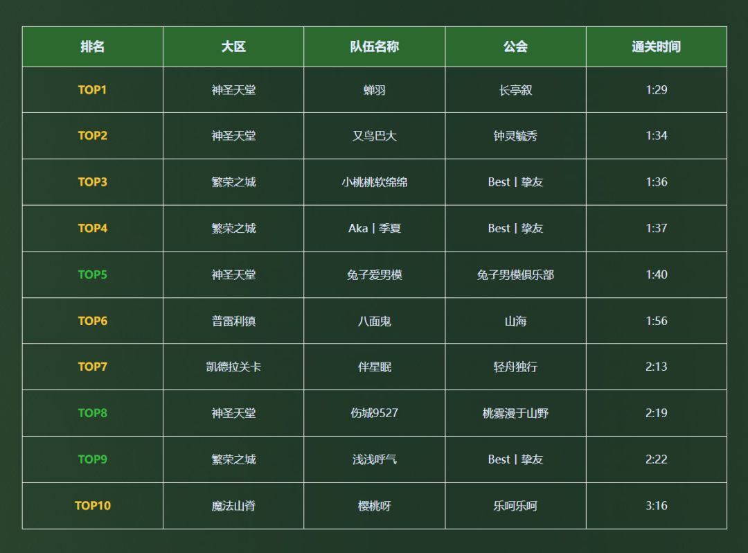 硬核绿龙竞速大赛—最强团队之战已进入白热化冲刺阶段!经过多日激烈角逐,各大区战队凭借默契配合与极致操作刷新纪录,现将当前排行榜前十名(按竞速时长排序)正式公示,见证荣耀时刻。接下来让我们看一下有哪几支队伍吧~