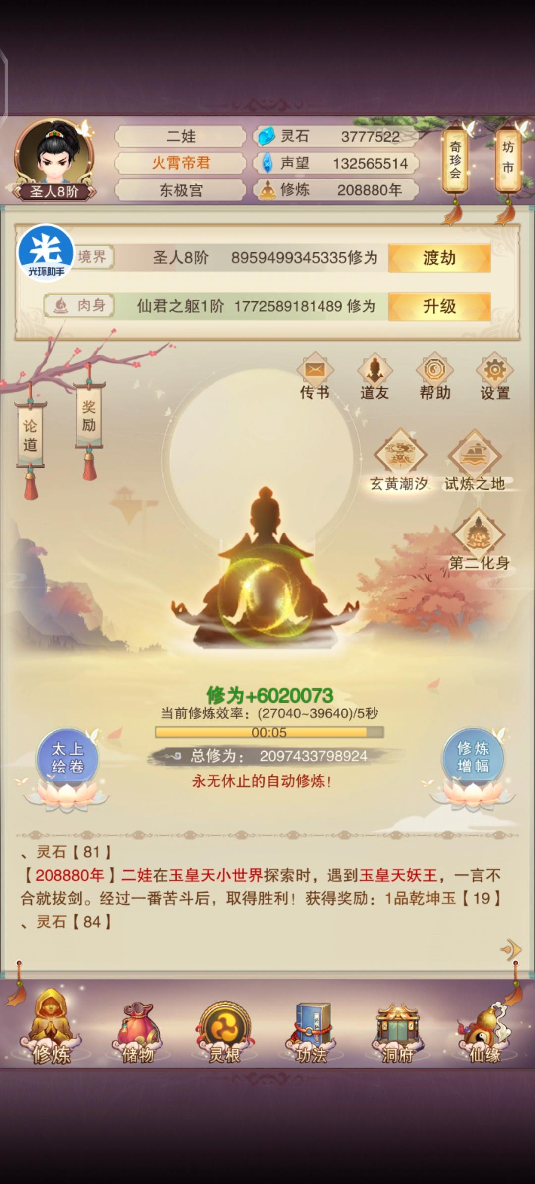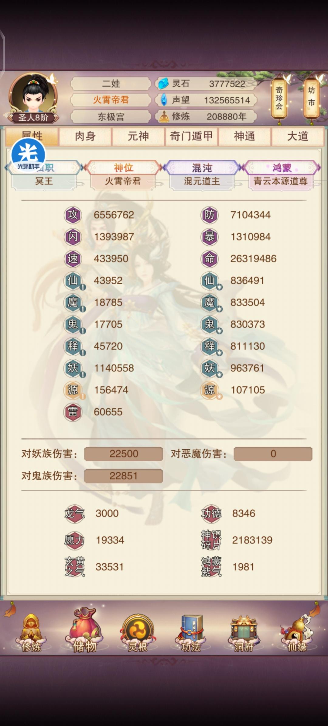 属性方面,攻击涨了191w,防御涨了208w,血涨了846w,真伤涨了42w,打六星道尊是没问题了。
