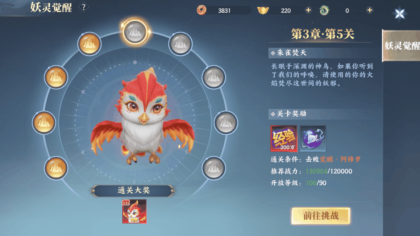 【开服不迷茫,跟着主线修仙】跟着主线走,不会错!前期就跟着主线任务做,能快速升级,还能体验游戏剧情。“妖灵觉醒”一定要打:1.通关送大量经验和培养材料2.打不过或打不了就先去“妖境”打装备或者过主线提升等级再来过完第一章你就有了第一只妖灵朱雀,记得把它放上阵!